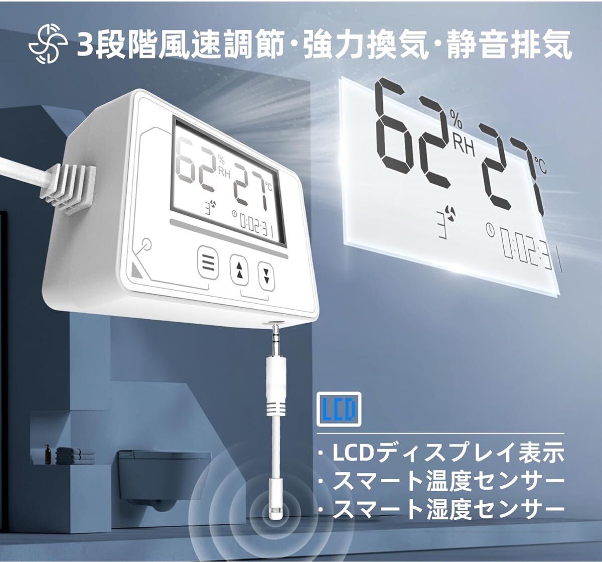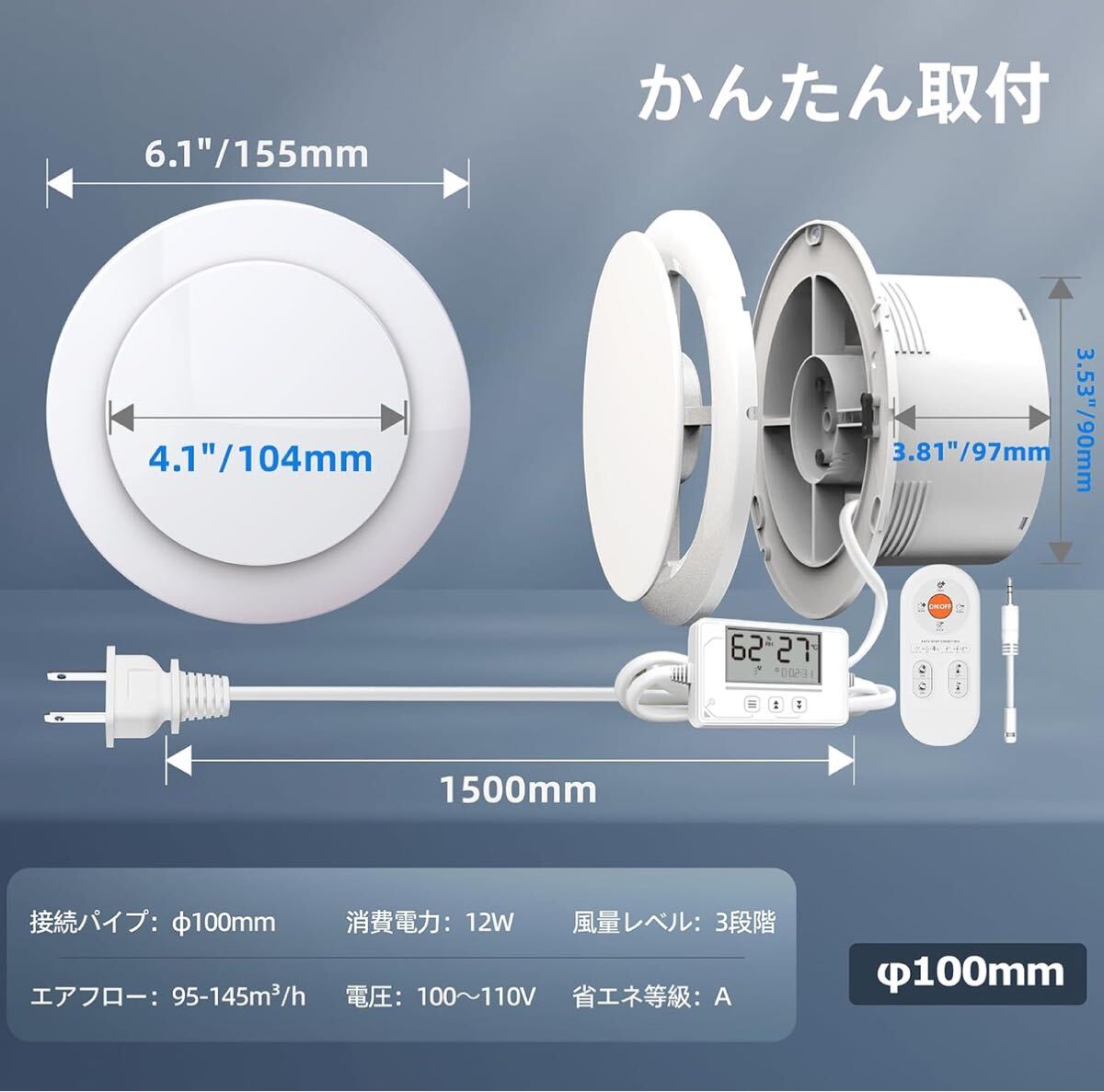 【換気扇 スマートコントロール&自動運転搭載】この100mm換気扇は、スマートコントロールで空気循環を自動運転する新モデルです。除湿や乾燥、空気の循環を効果的に行い、スマートホームにぴったりの信頼できるパートナー。LCD大画面ディスプレイを搭載し、3段階の風量調節と0〜9時間50分のタイマー機能で、多機能かつ快適な換気を実現します。