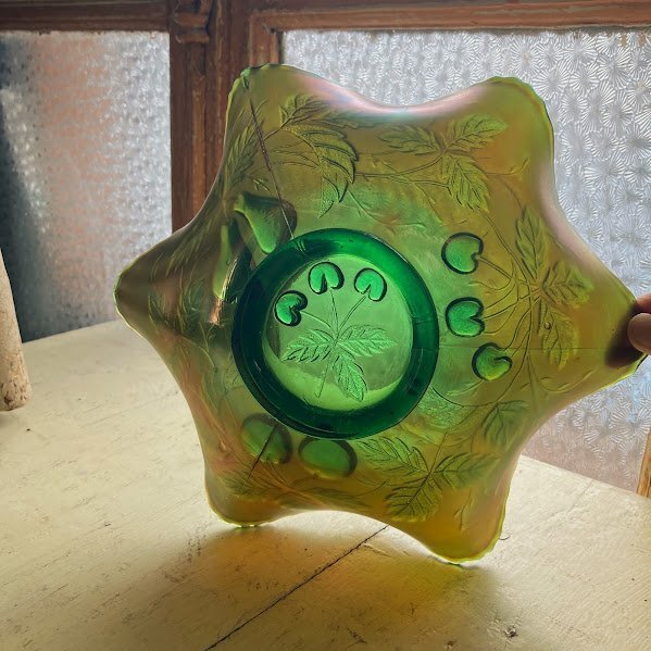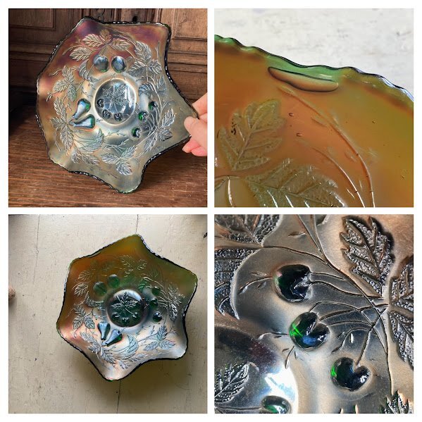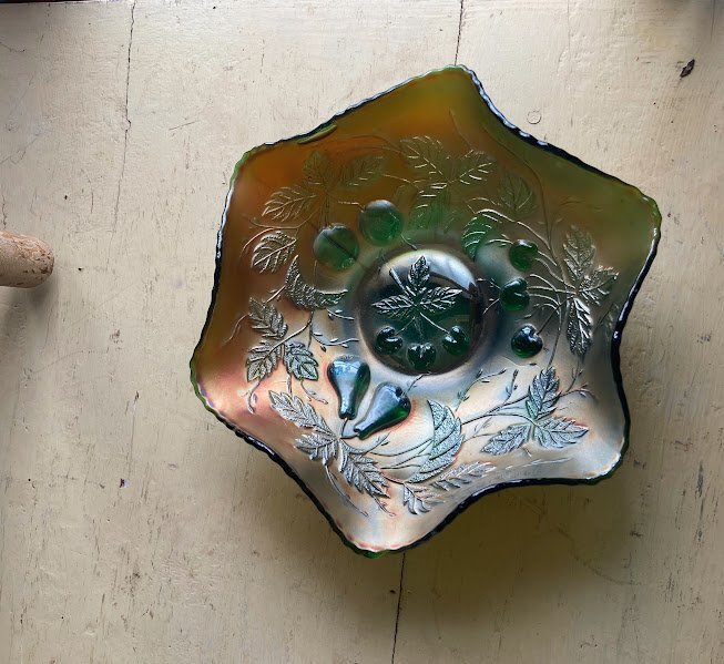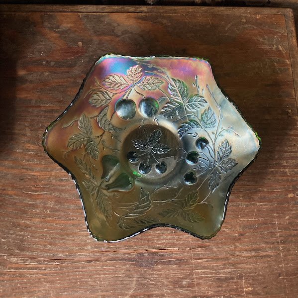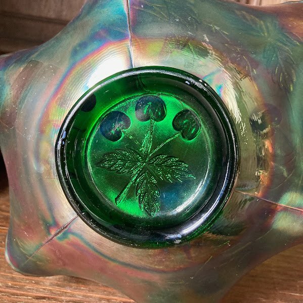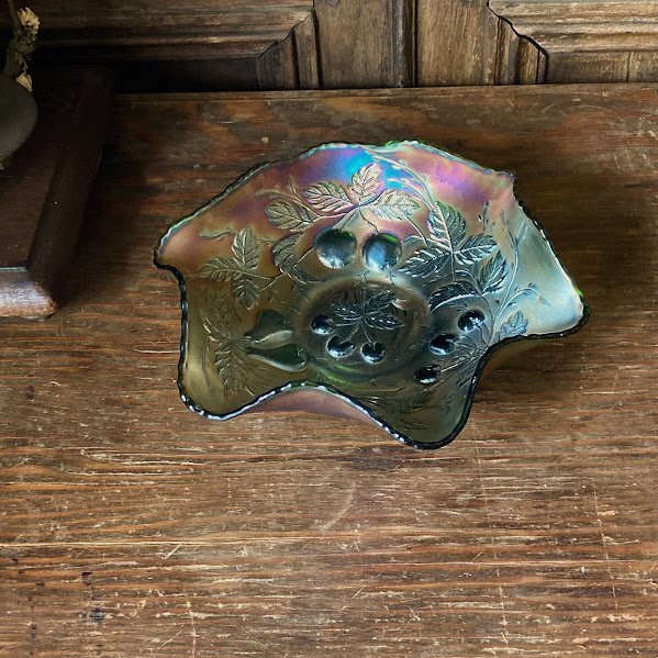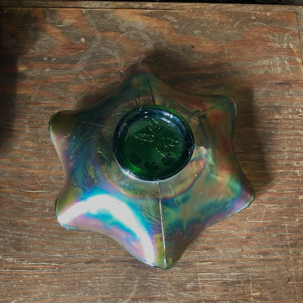 シャボン玉のような虹色が表面を覆いパールのような輝きを放つ鮮やかなカーニバルガラスの器【33-125】