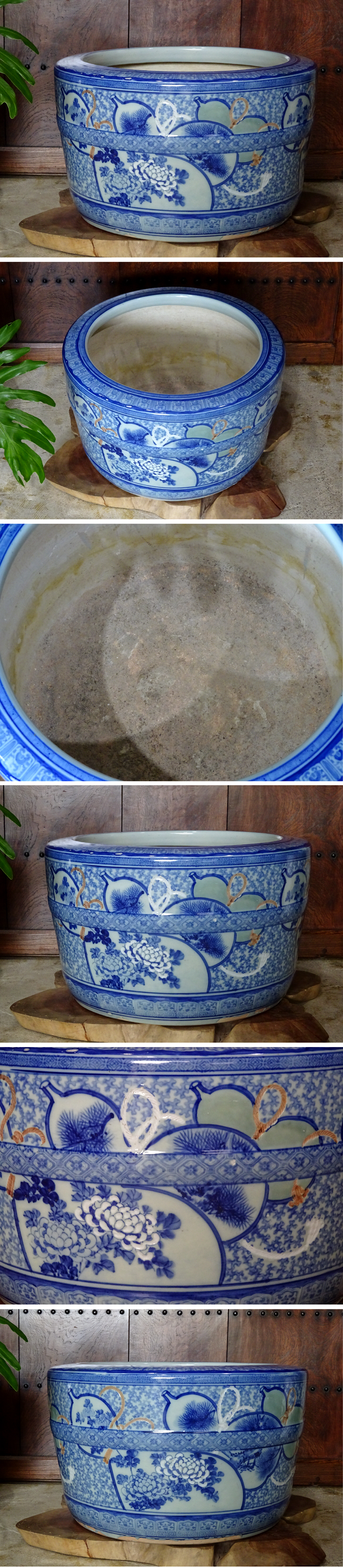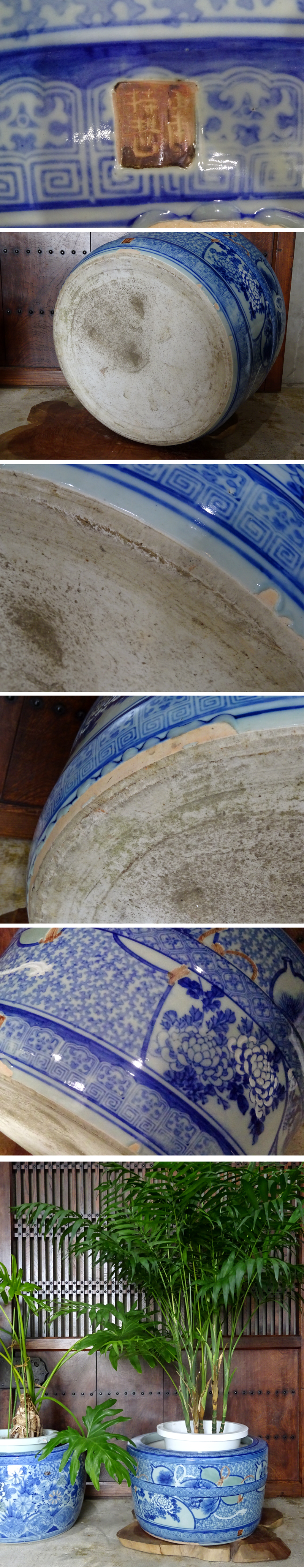 明治~大正時代 在銘『山本特製』 古伊万里 青磁染付陽刻 瓢箪蛸唐草文 火鉢 観葉植物鉢カバー 植木鉢 メダカ鉢、金魚鉢にも S14