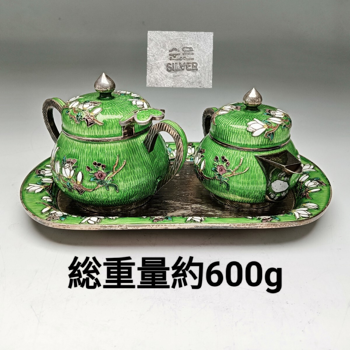 【W0111】韓国 銀製 SILVER刻印 七宝 茶器セット ポット シュガーポット トレイ スプーン 銀七宝 七宝細工 エナメル 総重量約600g
