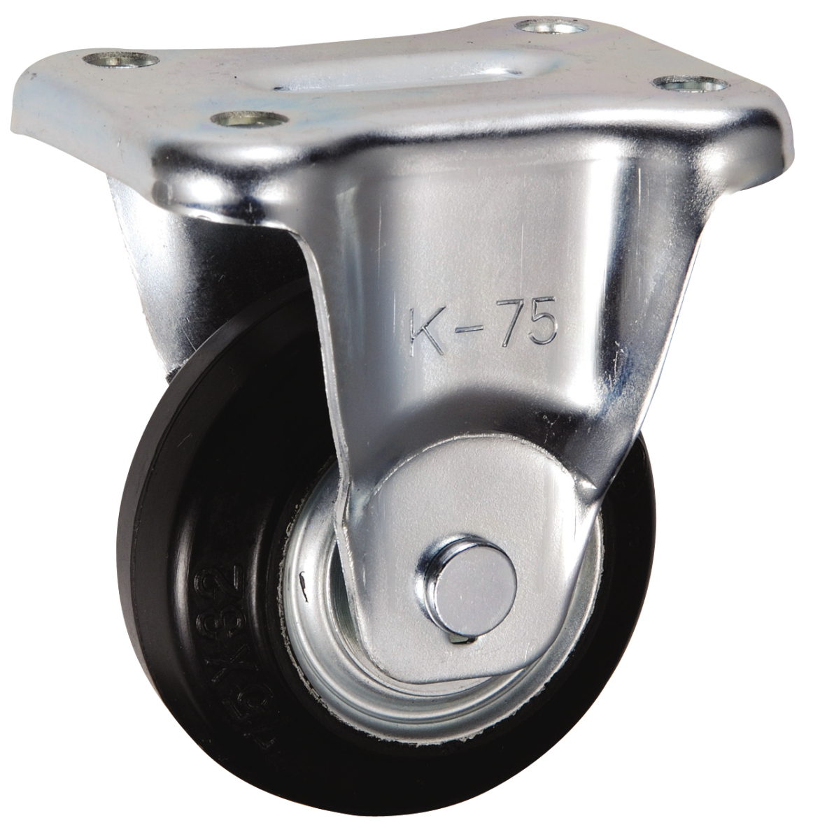 ゴム車輪が付いた固定キャスター。直進性を実現する固定金具とゴム車輪の組み合わせ。