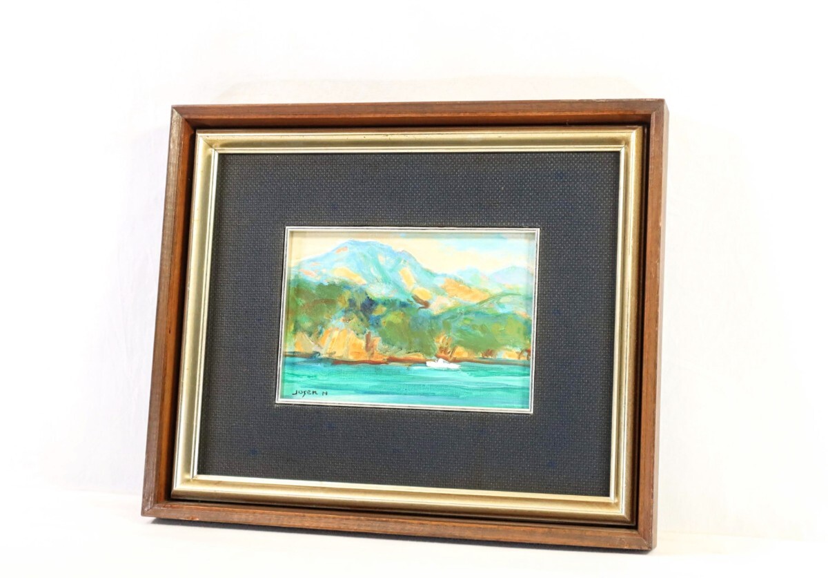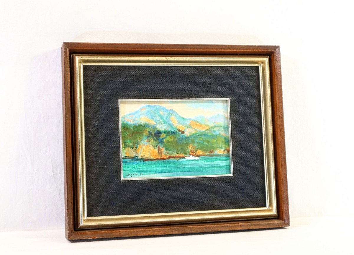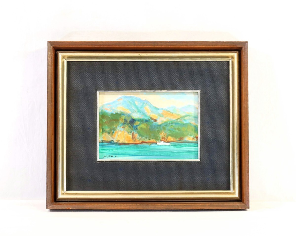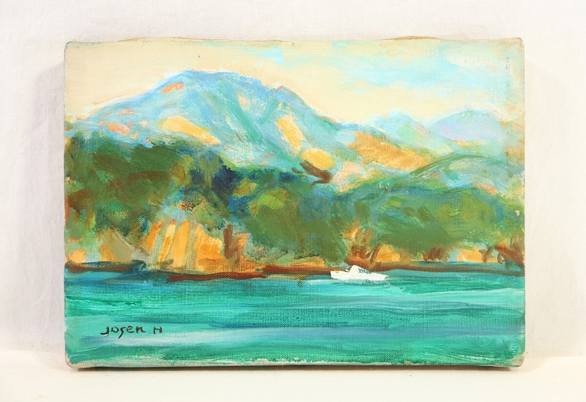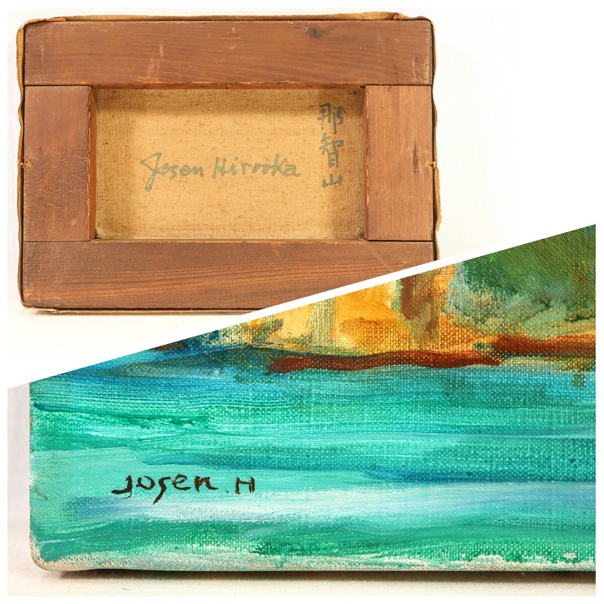 真作 広岡城泉 油彩「那智山」画寸 23cm×16cm SM 和歌山県那智勝浦町 太平洋、熊野灘の穏やかな海から望む那智の山々を描く 廣岡城泉 9731