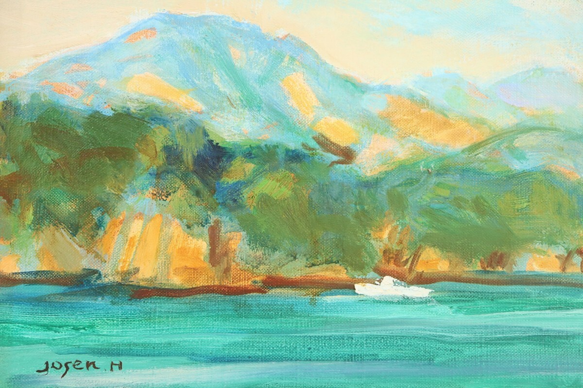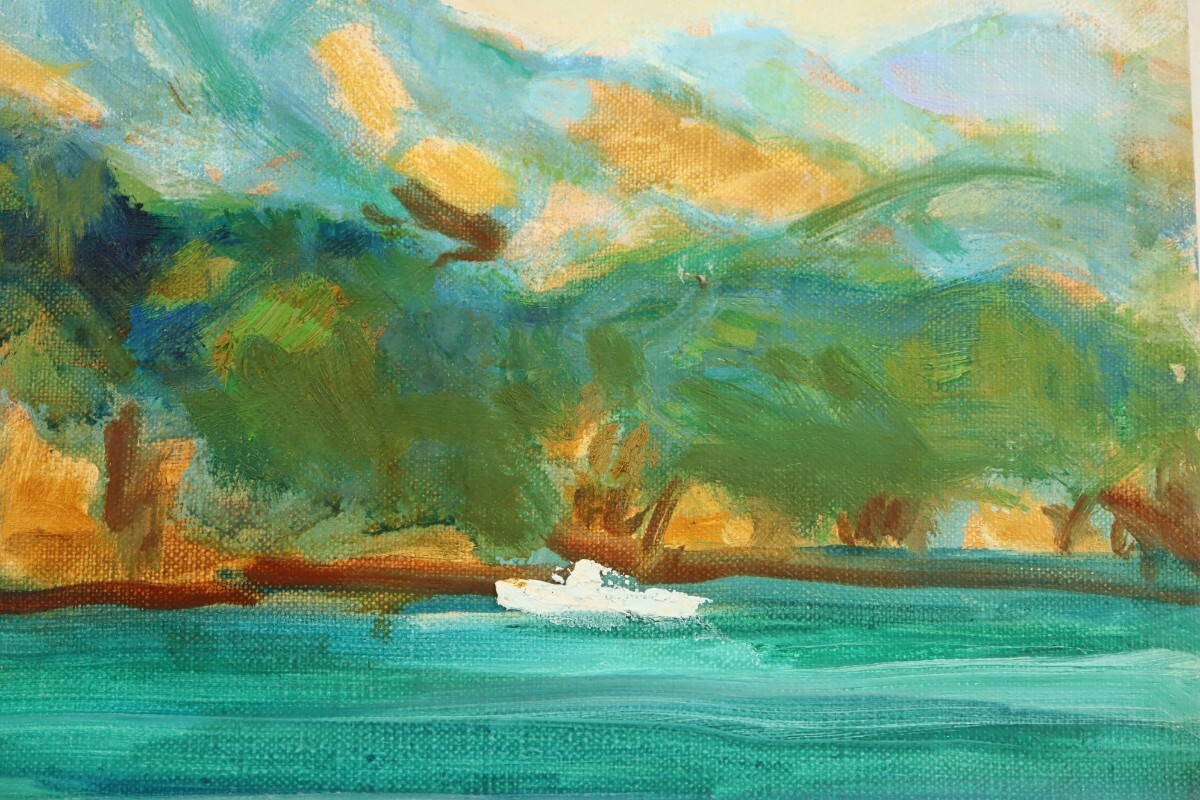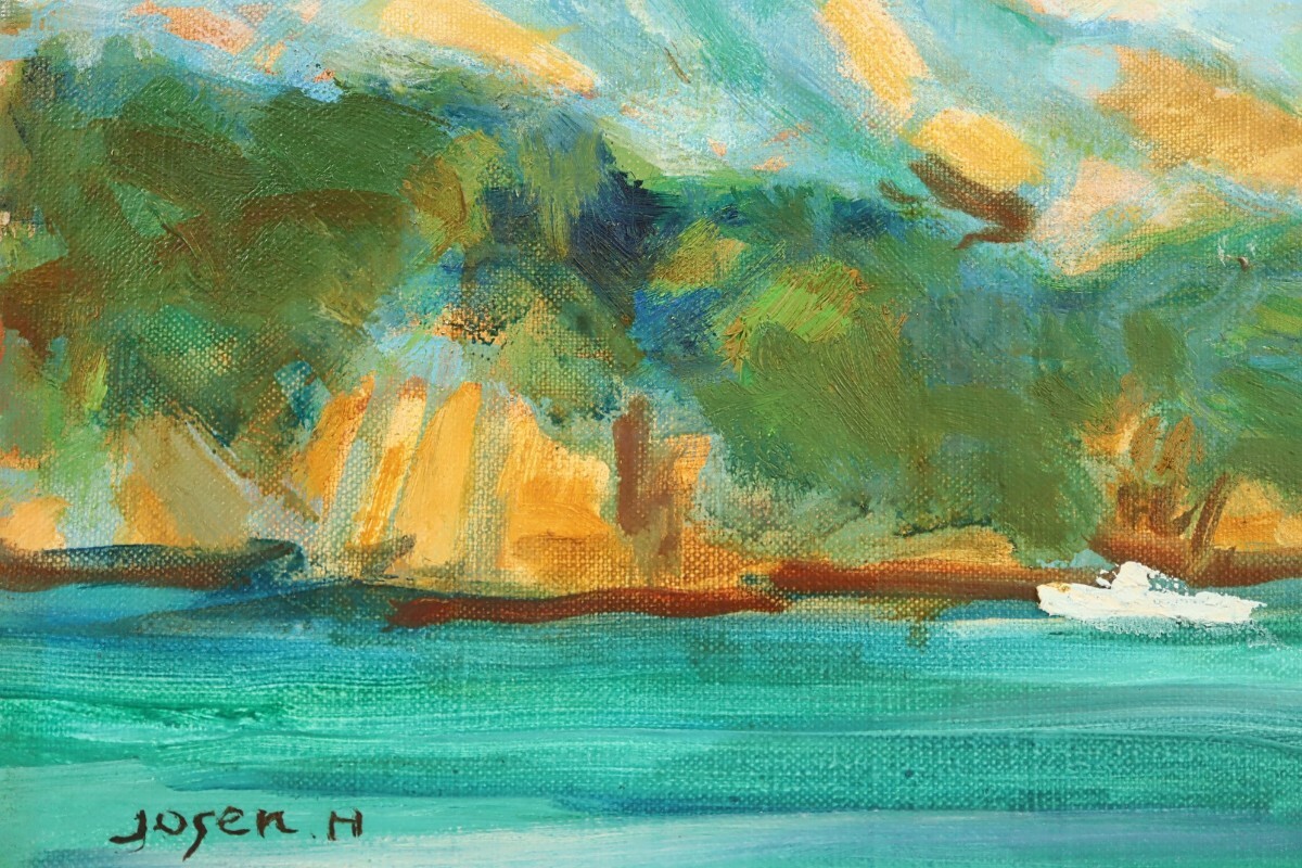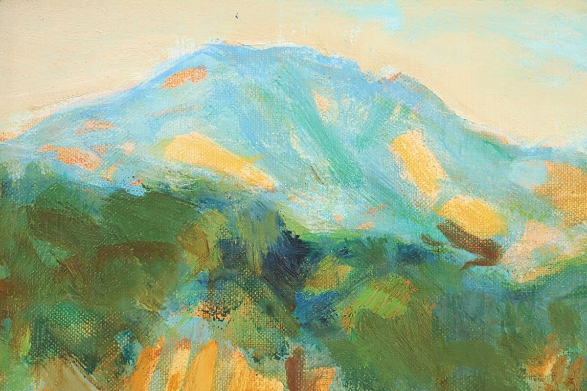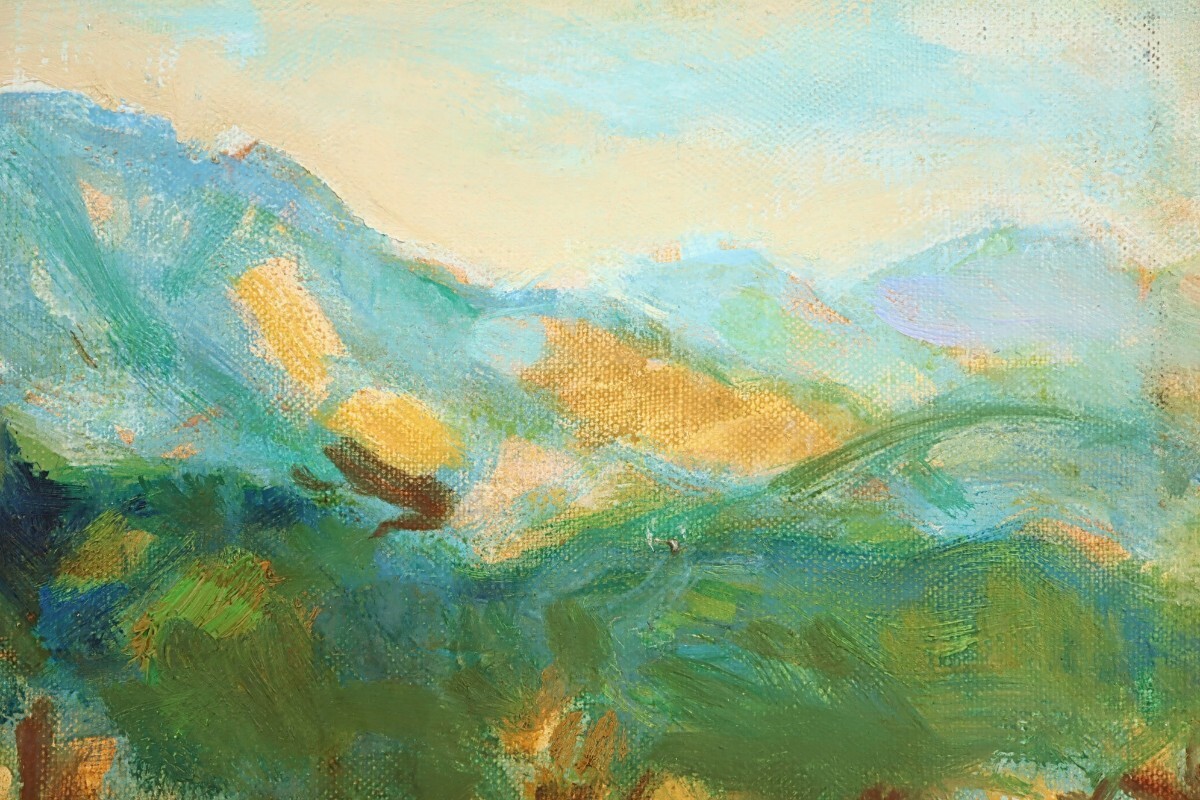 真作 広岡城泉 油彩「那智山」画寸 23cm×16cm SM 和歌山県那智勝浦町 太平洋、熊野灘の穏やかな海から望む那智の山々を描く 廣岡城泉 9731