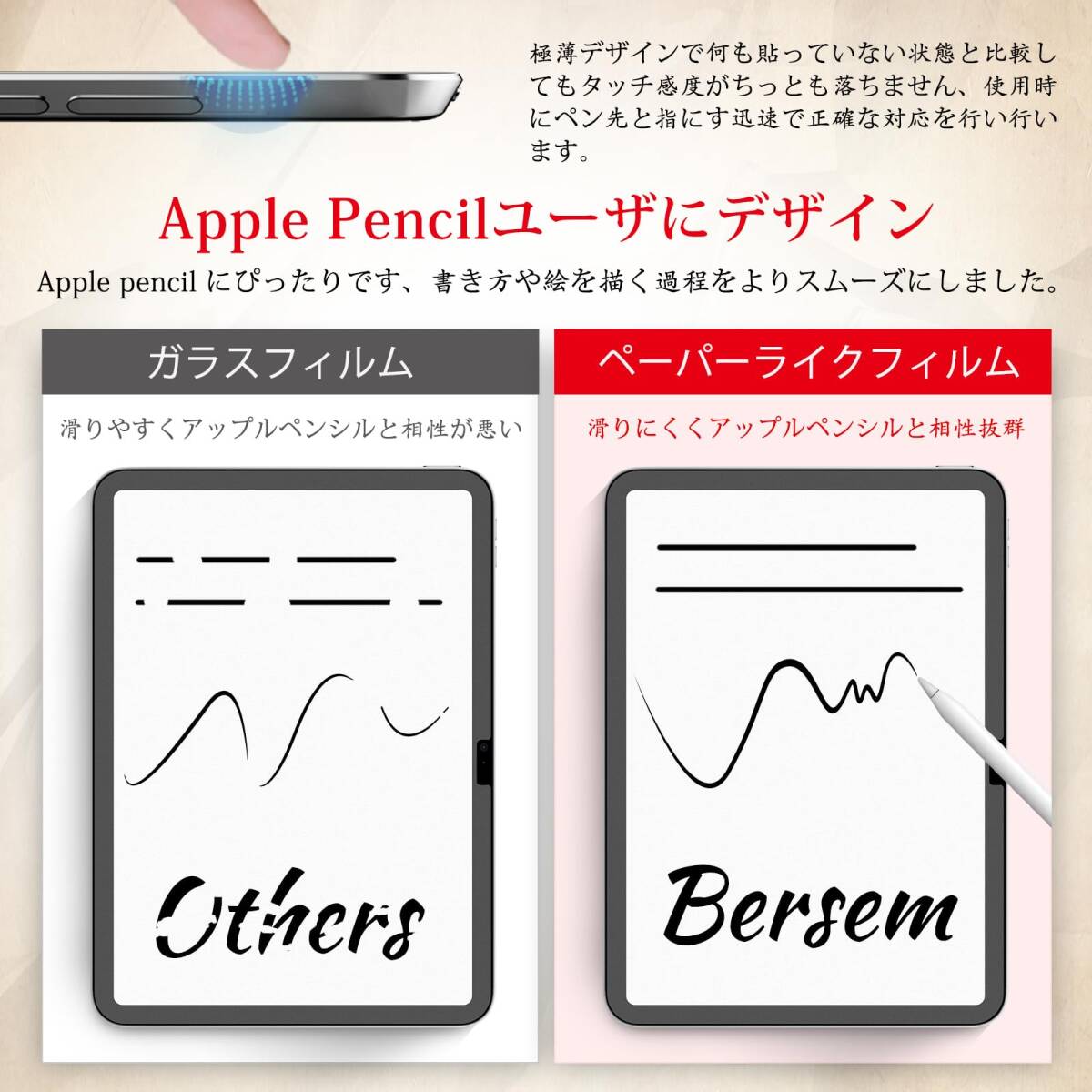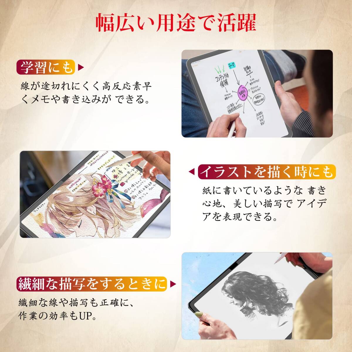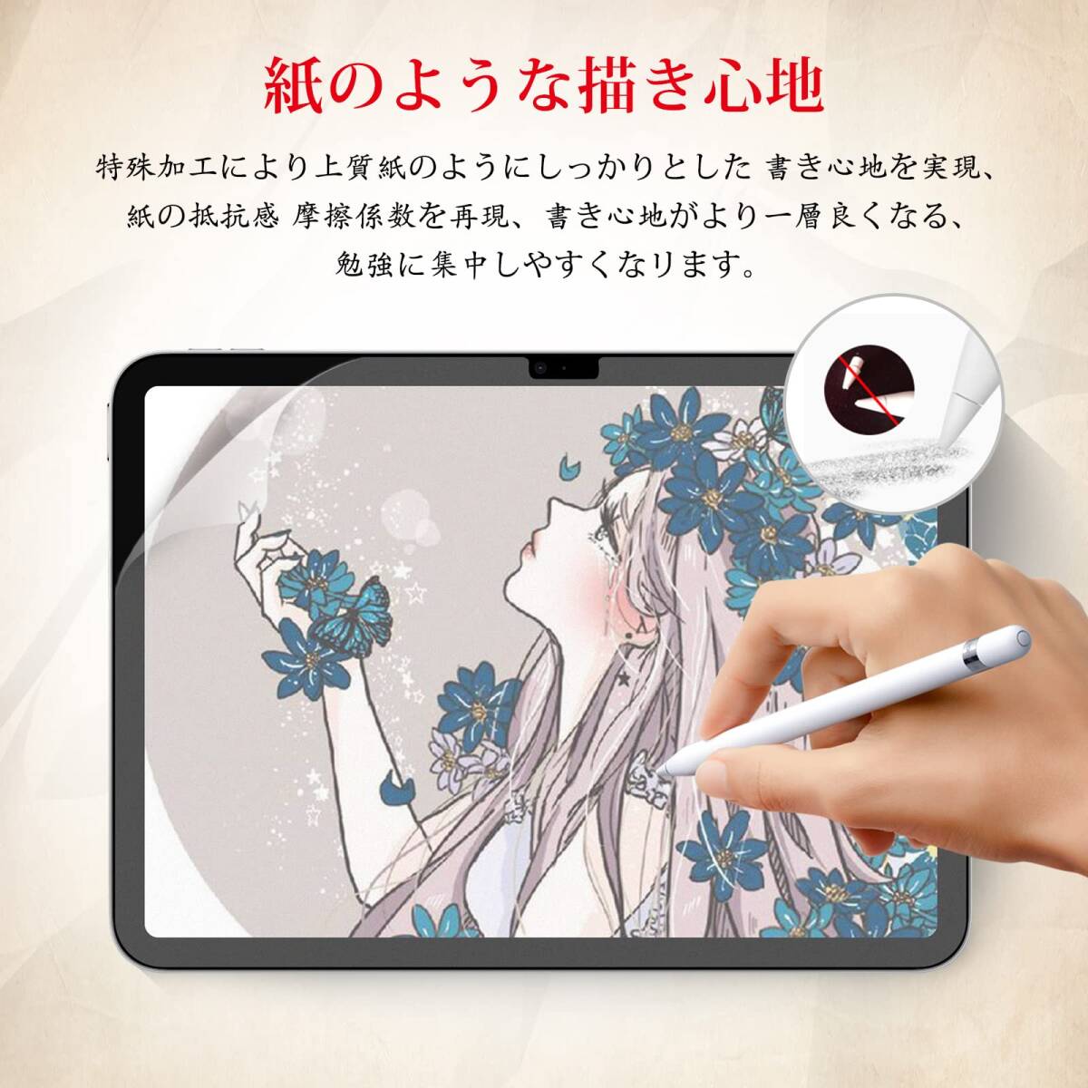 【ケント紙のような描き心地】iPad 10世代 ペーパーフィルムは日本からの高密度素材を採用し、適度な摩擦と抵抗力があり、文字やイラストなどを書き込む際に滑りにくく、紙のような質感を楽しめます。また、ペーパーフィルムはApple pencilと交換性があり、ストロークが滑らかでペン先磨耗も抑えられ、快適な書き心地を実現します。