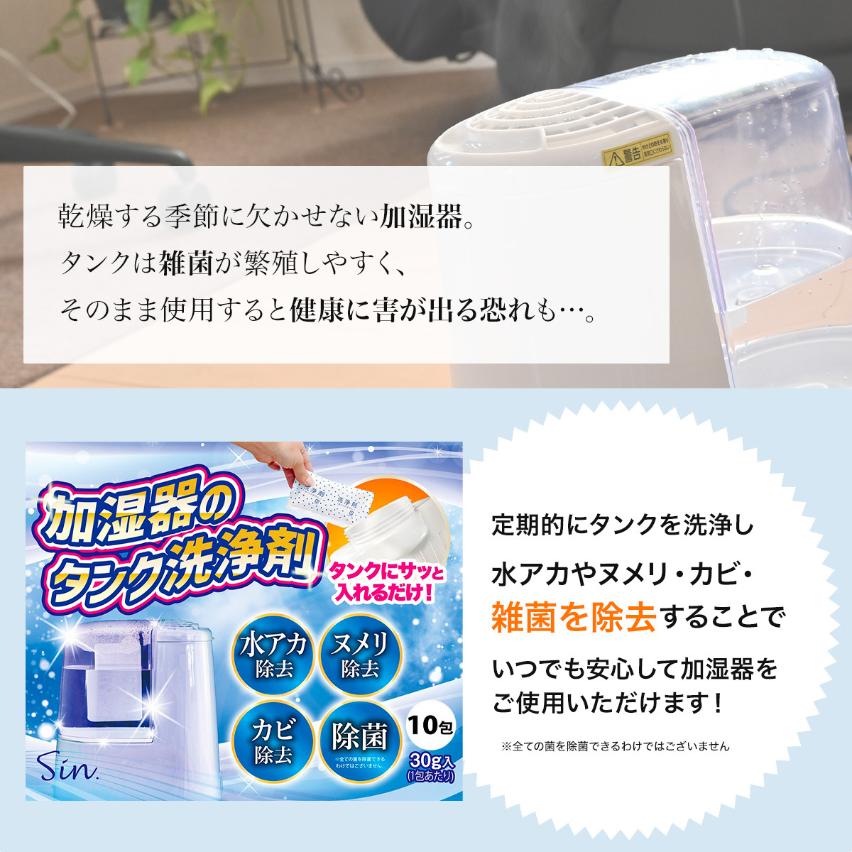 | 説明 | 加湿器のタンクには雑菌が繁殖しやすく、放置したまま加湿器を使用すると、健康に害が出る恐れがございます。 定期的にタンクを洗浄することで、加湿器を安心してご使用頂けます。本品と水を加湿器に入れ、放置するだけで洗浄できます(頑固な汚れはブラシなどでこするとより効果的です) 加湿器タンク 2L~4Lに1包をお使いください。 製造:日本 |