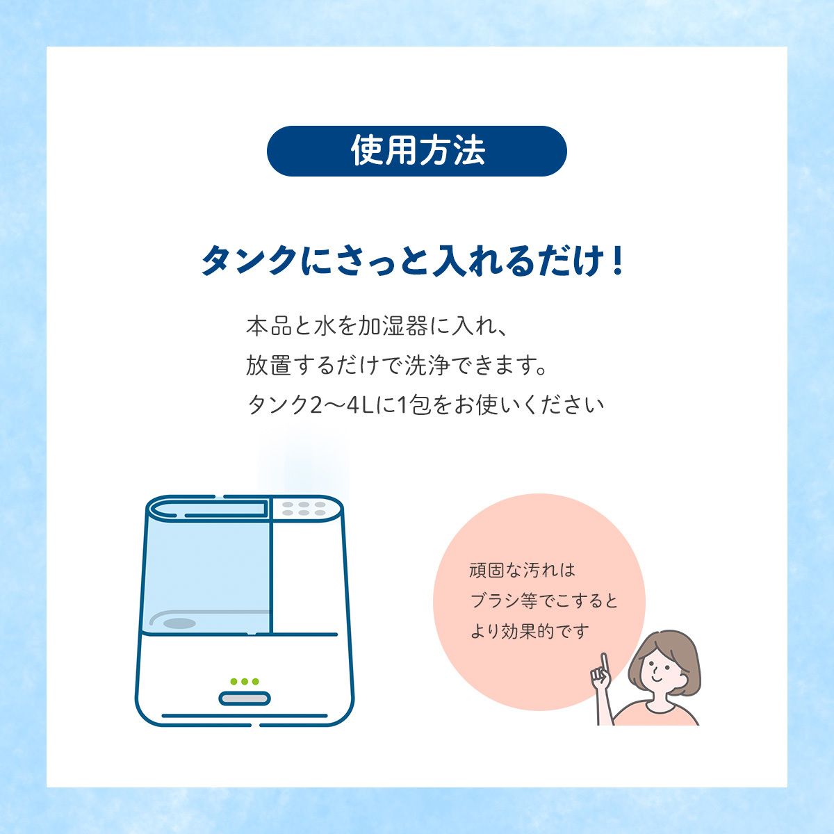 | 使用上の注意 | タンクにぬるま湯と本品を入れ、浸け置きし水洗いしてください。2~4Lに1包が目安です。※タンクが取り外せないときは本品を投入したまま使用できます。 |
