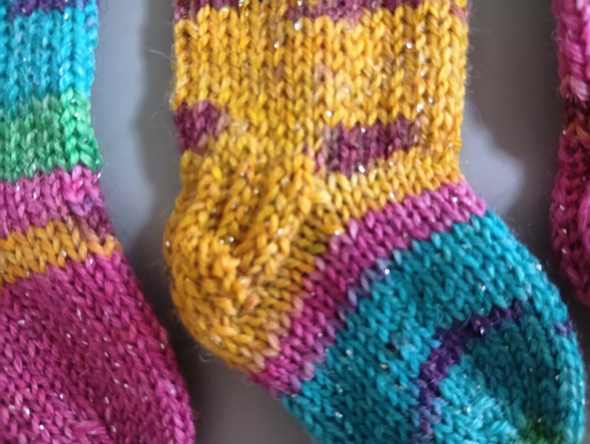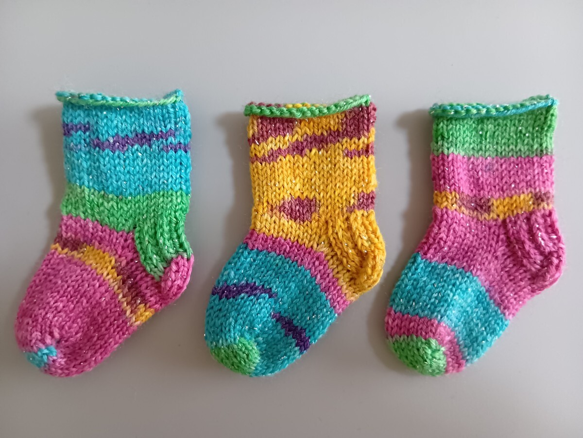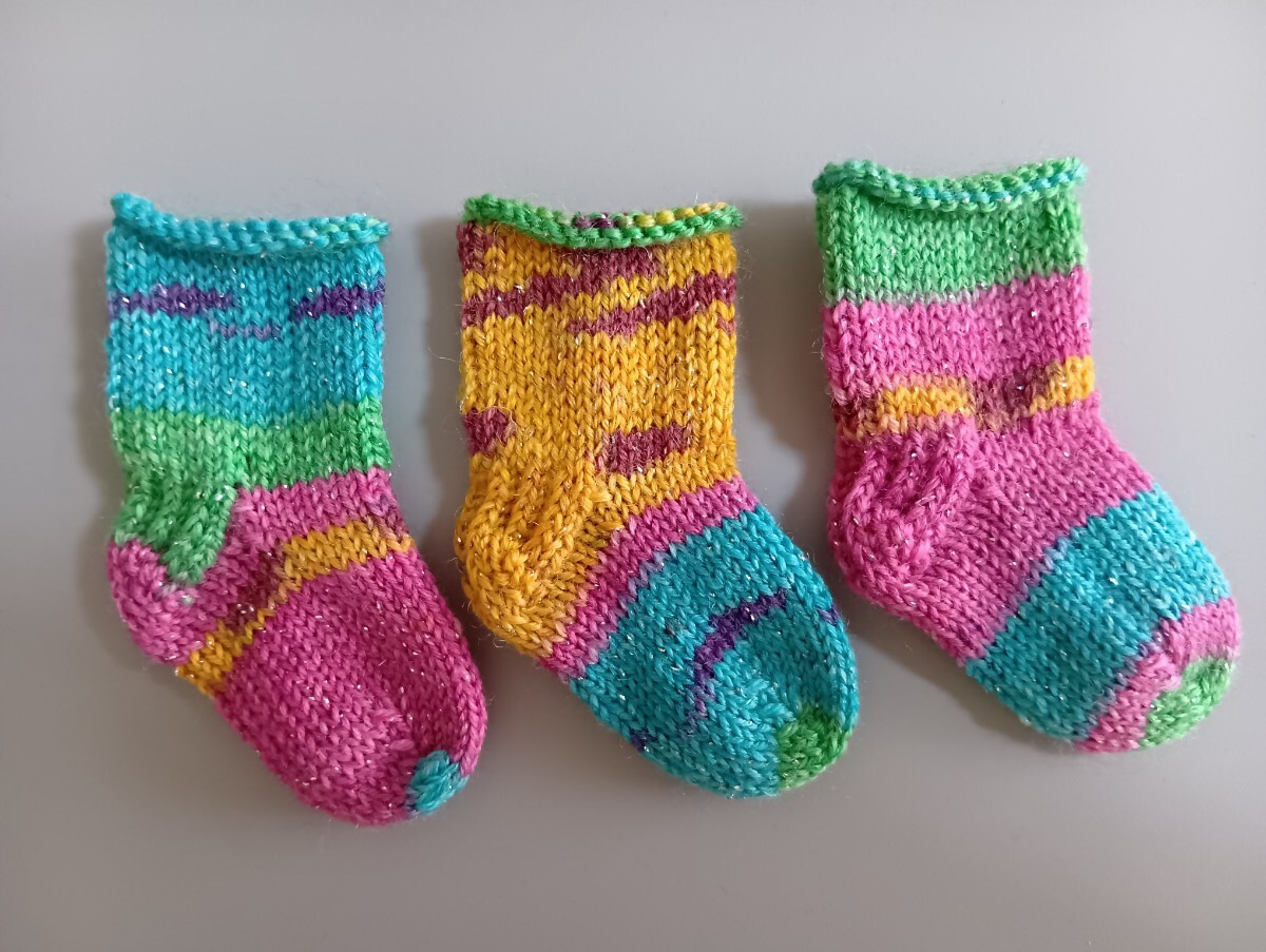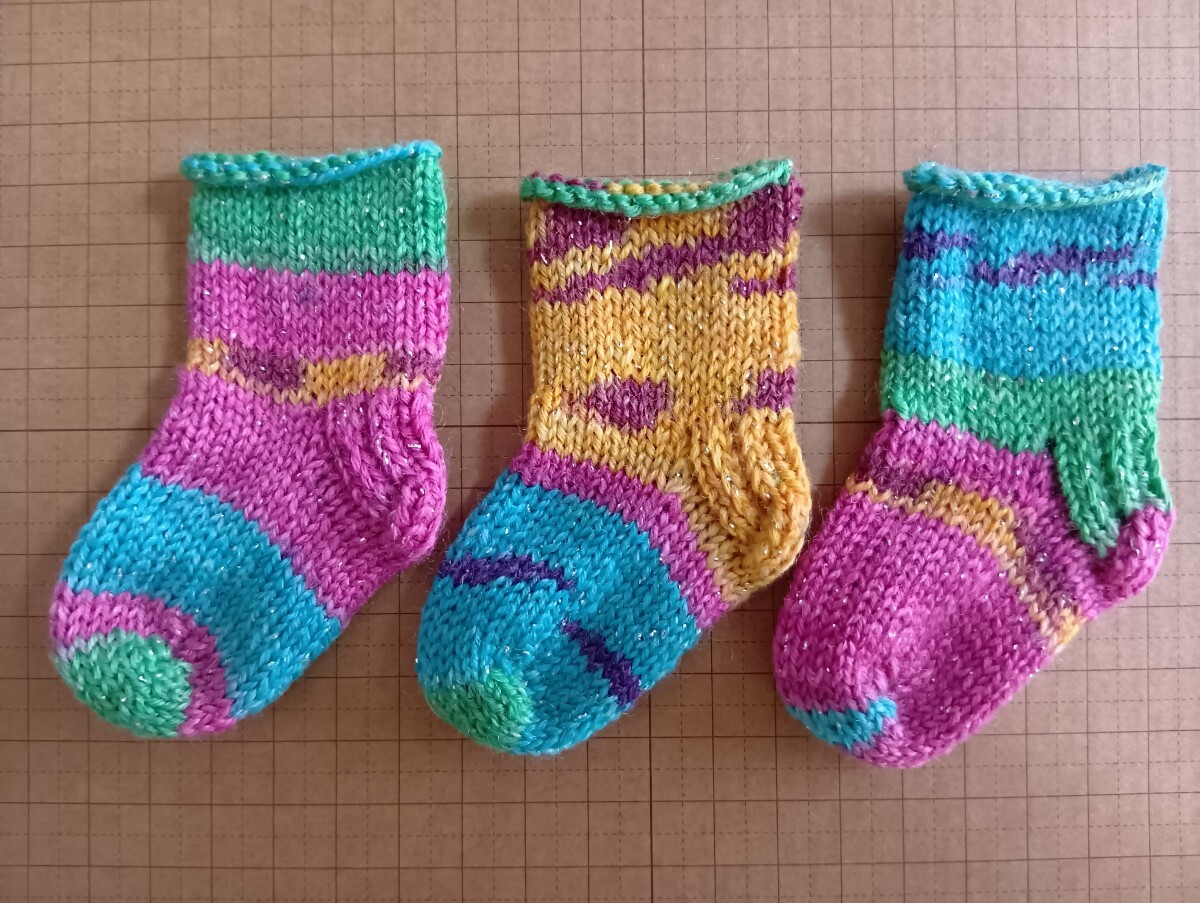 ラメがかわいいopal毛糸でミニ靴下を編みました。 3点セットです。オーナメント、ガーランド、ストラップ、ブローチなどにいかがでしょうか。