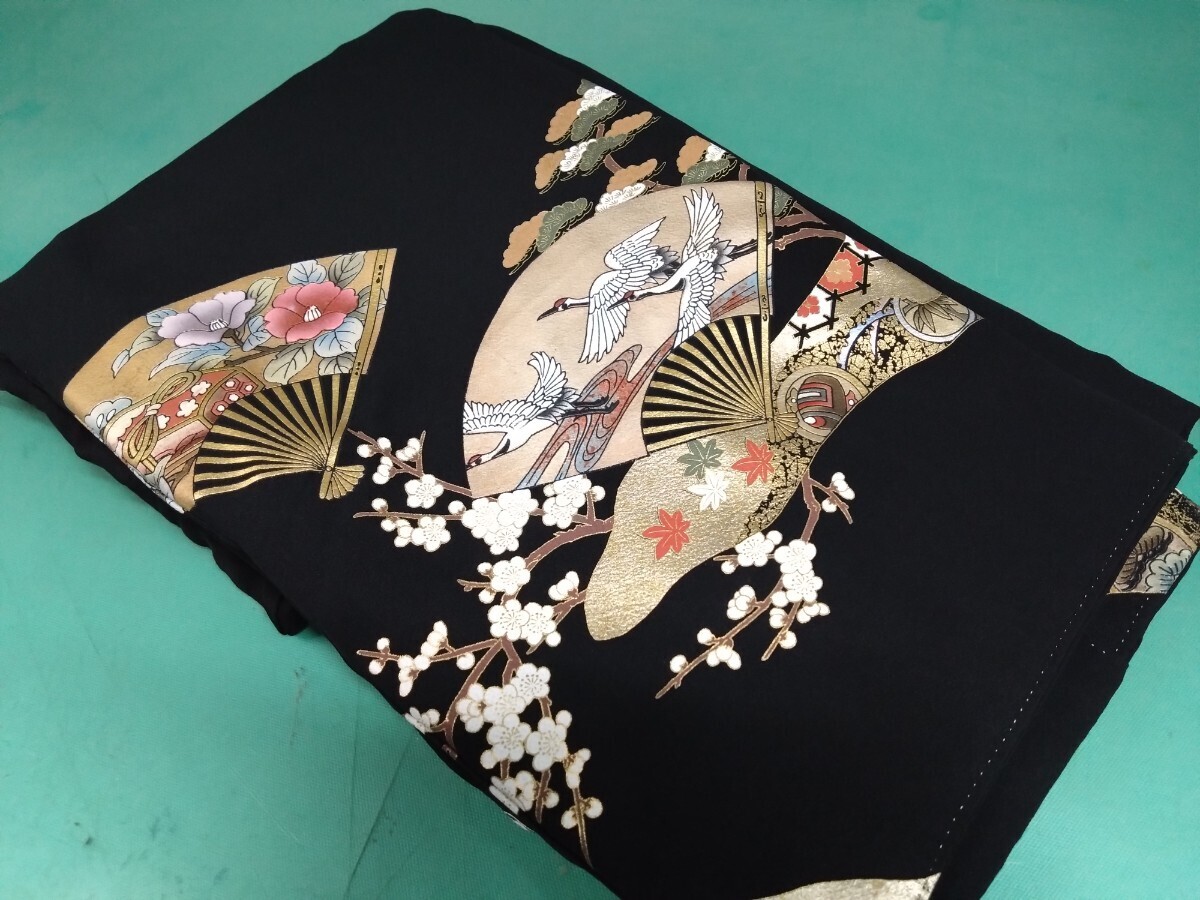 25【本金箔】【友記工芸】落款 黒留袖 着丈147cm 裄丈57cm 正絹 着物 豪華絢爛 五つ紋 丸に木瓜 鶴 雅 繊細 美術品 中古 になります。