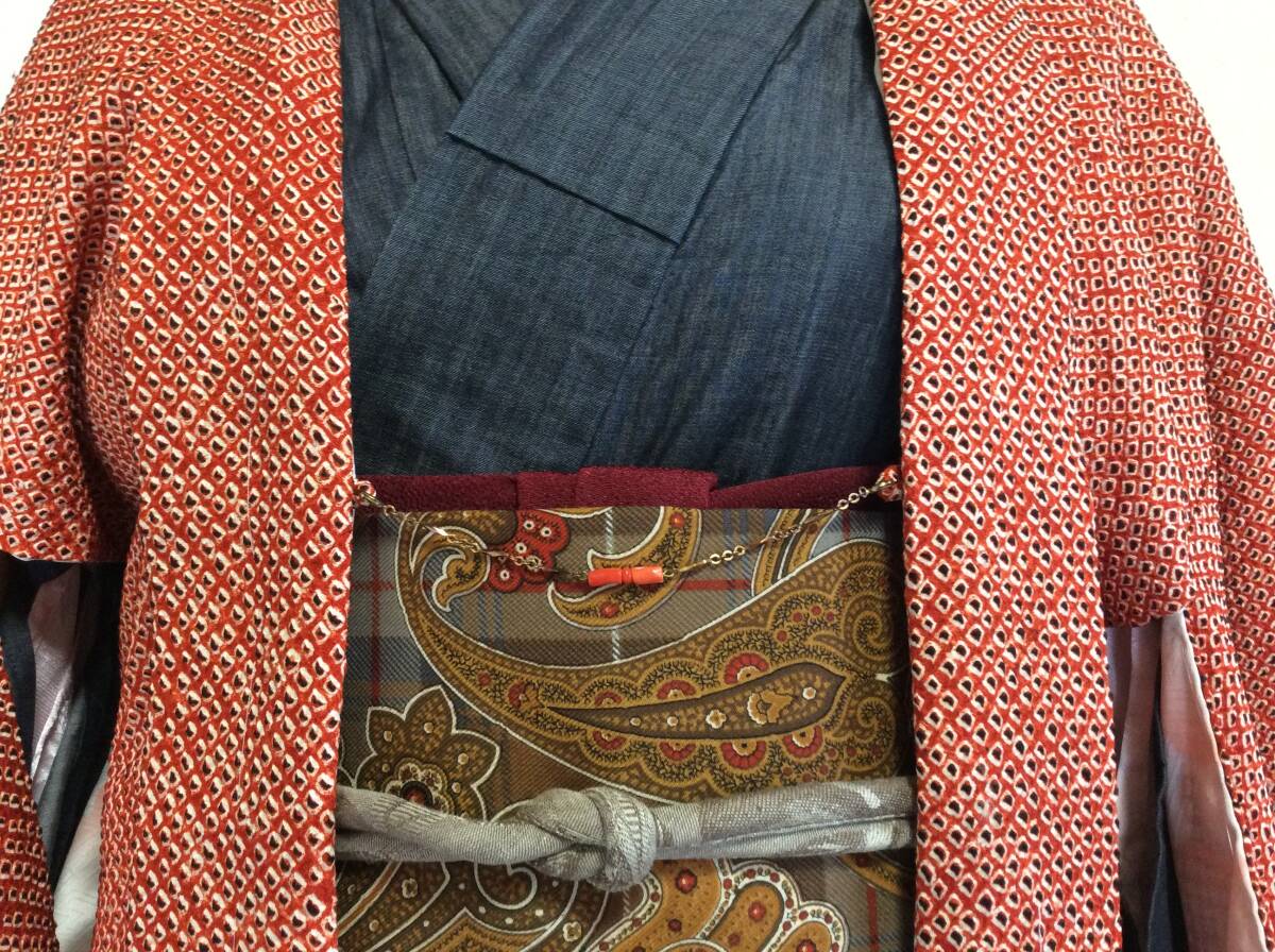 即決 しつけ付き アンティーク羽織 裄丈64.5 茶系オレンジ 総絞り 羽織紐(チェーン)付定形外郵便込 紅葉狩りやご旅行にも♪