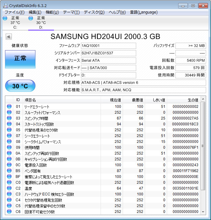 どちらにも不良セクタの表示は何もありません。動作は問題なく、良品と思います(^o^)