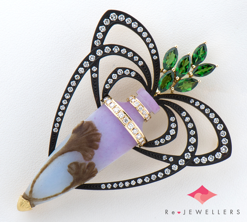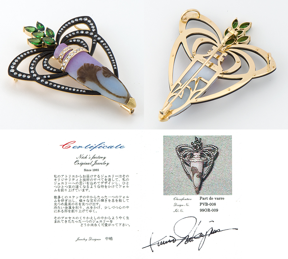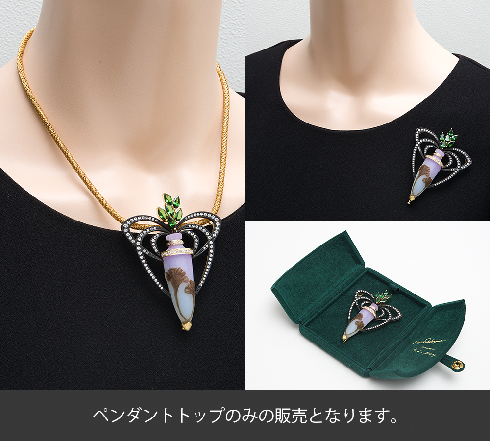 独特の色合いと質感を生み出すガラス工芸技法、パート・ド・ヴェールという技術を取り入れたボリュームのあるブローチ兼ペンダントトップです。鮮やかなガーネットのグリーンと柔らかな色彩のガラス瓶との対比が美しく、つくりも丁寧。芸術品のようなジュエリーです。