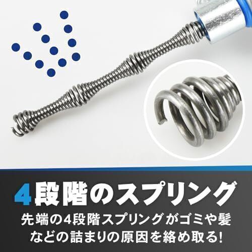 先端の4段階のスプリングが回転しながら汚れを取り除きます。緊急時だけでなく、水の流れが悪くなった際の詰まり対策としてもお使いいただけます。