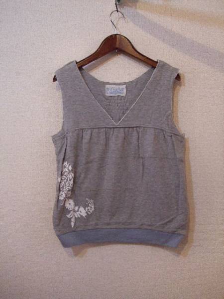 | 商品紹介 | 右横の花モチーフのプリントがオシャレなノースリーブです。 薄手のトレーナー生地でインナーによって色々な着こなしが楽しめます。 素材:コットン100% |