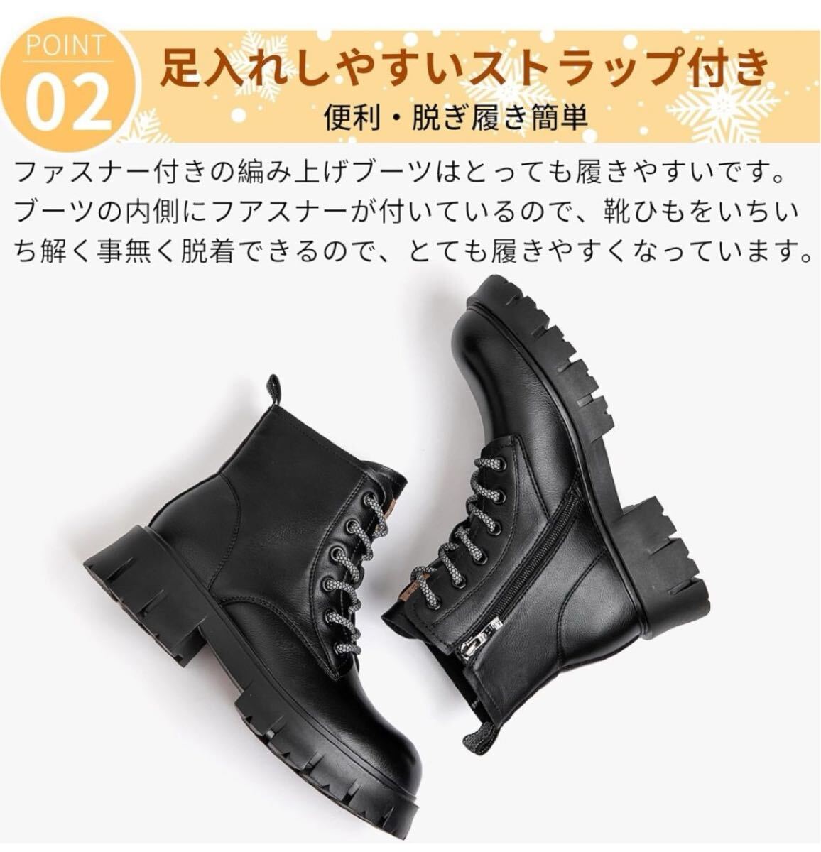 ファスナー付きの編み上げブーツはとっても履きやすいです。ブーツの内側にフアスナーが付いているので、靴ひもをいちいち解く事無く脱着できるので、とても履きやすくなっています。