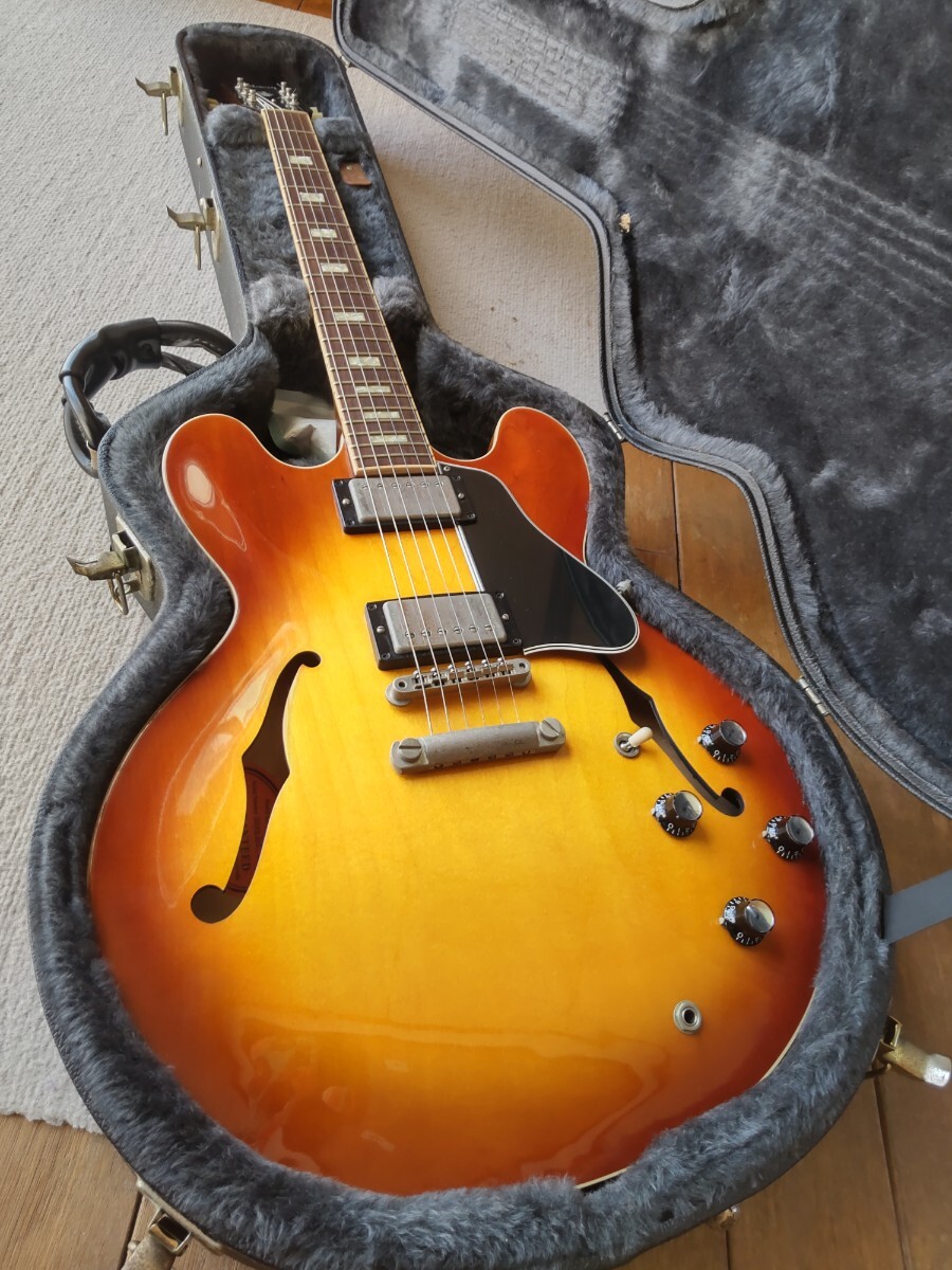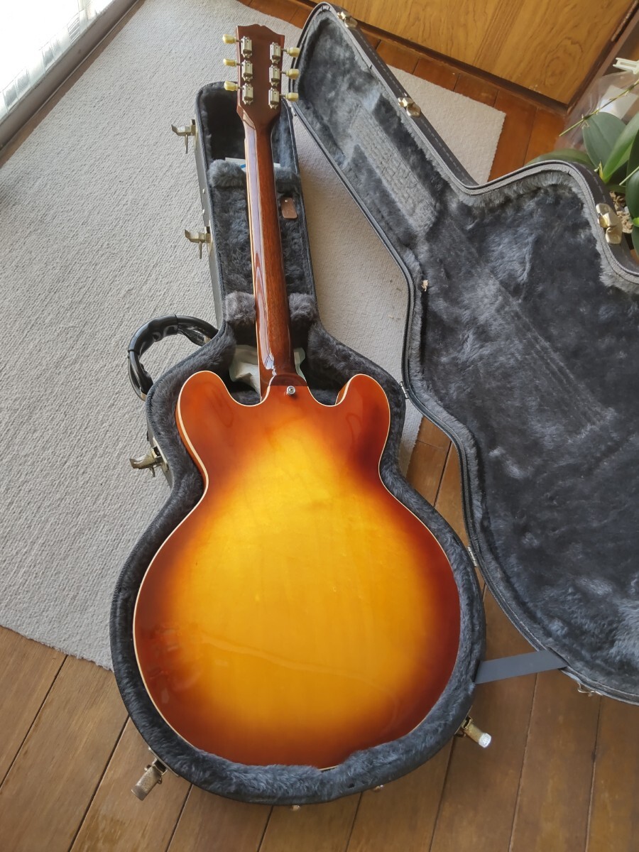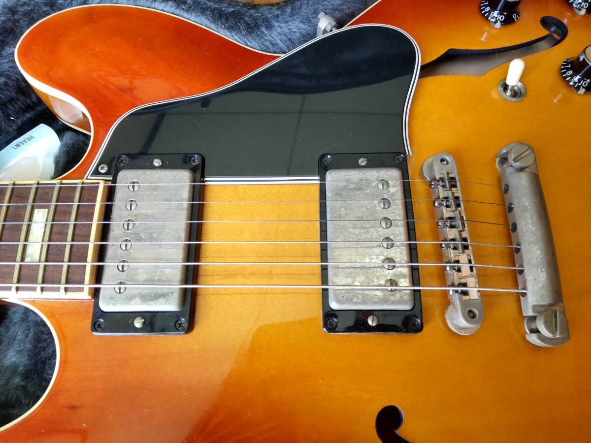木材は2000年代初頭ですので、Gibsonも気合が入っており、木材も枯渇状態ではないため大変よい物を使用しています。20年位経過しているので木材も安定してきていると思います。セミアコでエアー感があり、鳴りもしっかりとしていて、アンプなしでも練習は可能、しかもアンプ大音量でもフルアコみたいなハウリングはないので、ジャズ・ブルース~ロック・メタルまで対応可能です。ソリッドより大きめのギターで、デイブ・グローリーのように低く構えてゴリゴリロックもよし、ジャズ・ブルースプレイヤーのように高く抱え込むように構えて弾いてもカッコいいです。ハードケースは壊れてはないようですが、経年劣化はあります。ワンオーナーでかなり程度のよいギターですが、素人が所有しているものでブリッジなどの金属部等、音に悪影響はないですが(エイジト加工されたギターの音は良いので、逆によい影響があるとは思います)経年変化しているパーツがあることをご理解頂き、返品等のない方のみ入札をお願い致します。