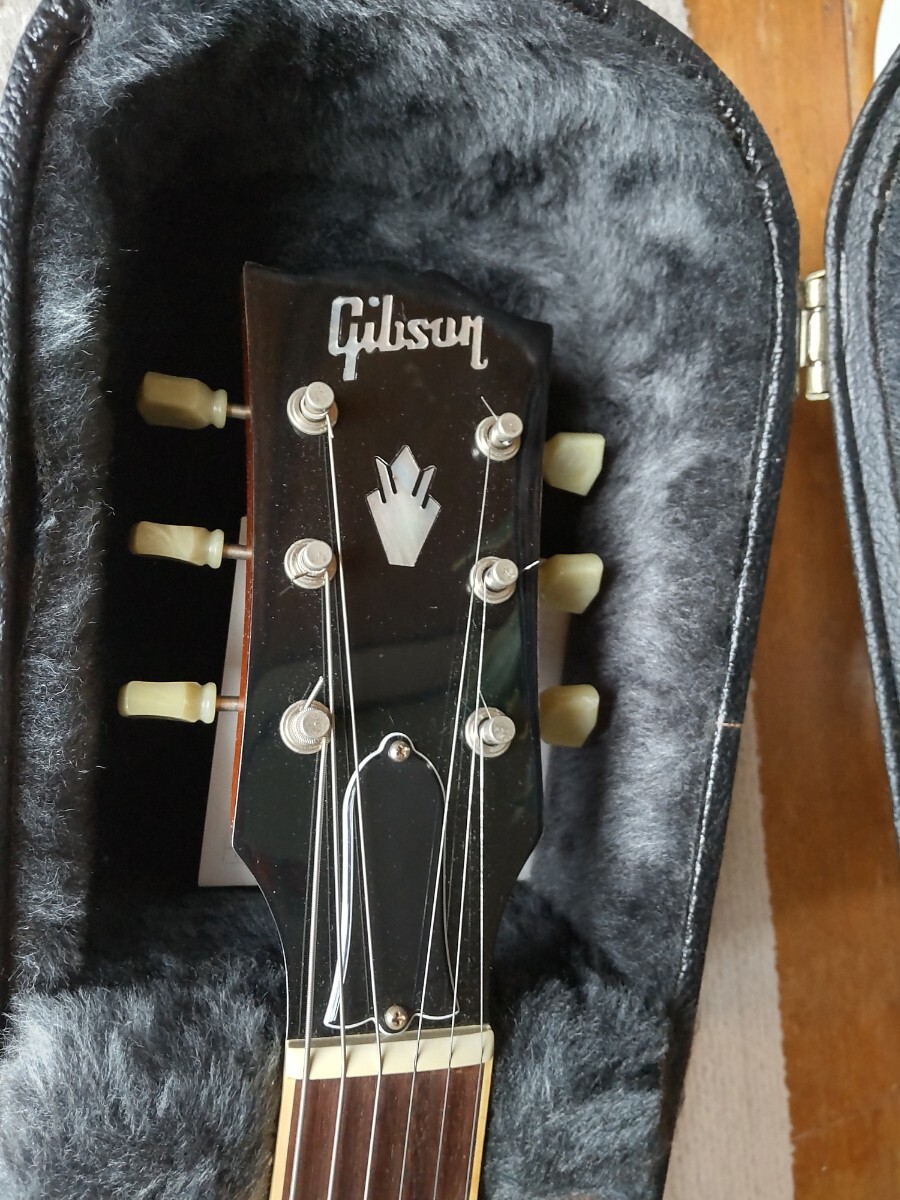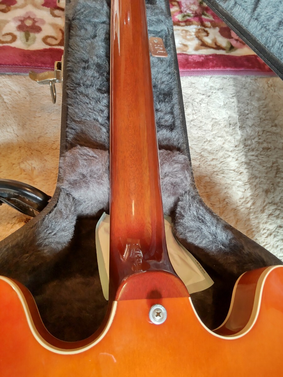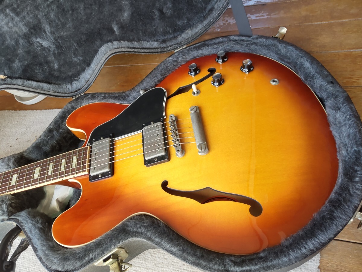 木材は2000年代初頭ですので、Gibsonも気合が入っており、木材も枯渇状態ではないため大変よい物を使用しています。20年位経過しているので木材も安定してきていると思います。セミアコでエアー感があり、鳴りもしっかりとしていて、アンプなしでも練習は可能、しかもアンプ大音量でもフルアコみたいなハウリングはないので、ジャズ・ブルース~ロック・メタルまで対応可能です。ソリッドより大きめのギターで、デイブ・グローリーのように低く構えてゴリゴリロックもよし、ジャズ・ブルースプレイヤーのように高く抱え込むように構えて弾いてもカッコいいです。ハードケースは壊れてはないようですが、経年劣化はあります。ワンオーナーでかなり程度のよいギターですが、素人が所有しているものでブリッジなどの金属部等、音に悪影響はないですが(エイジト加工されたギターの音は良いので、逆によい影響があるとは思います)経年変化しているパーツがあることをご理解頂き、返品等のない方のみ入札をお願い致します。
