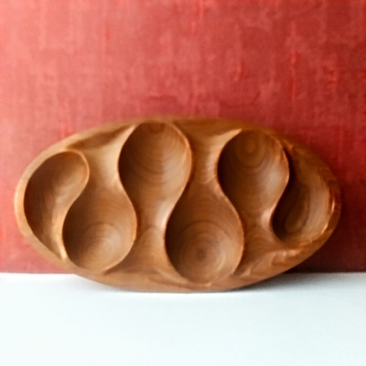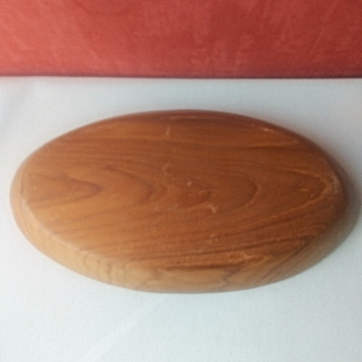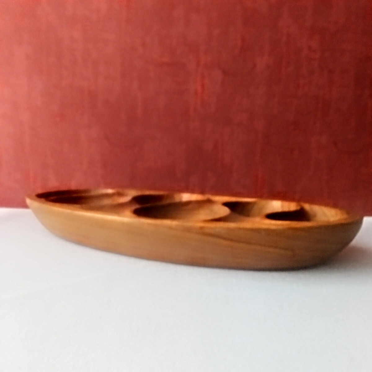 4cmもの厚みのあるチーク材を深くえぐるようにして形作られたフォルムは、トレイというよりオブジェと呼ぶのがふさわしい造形美を湛えています。