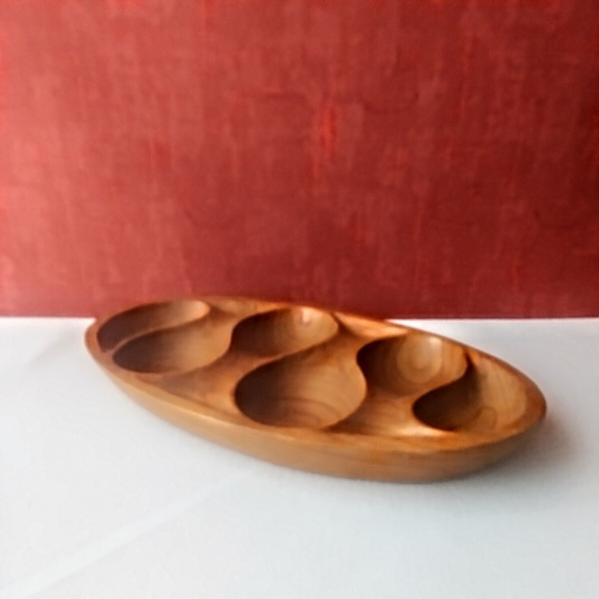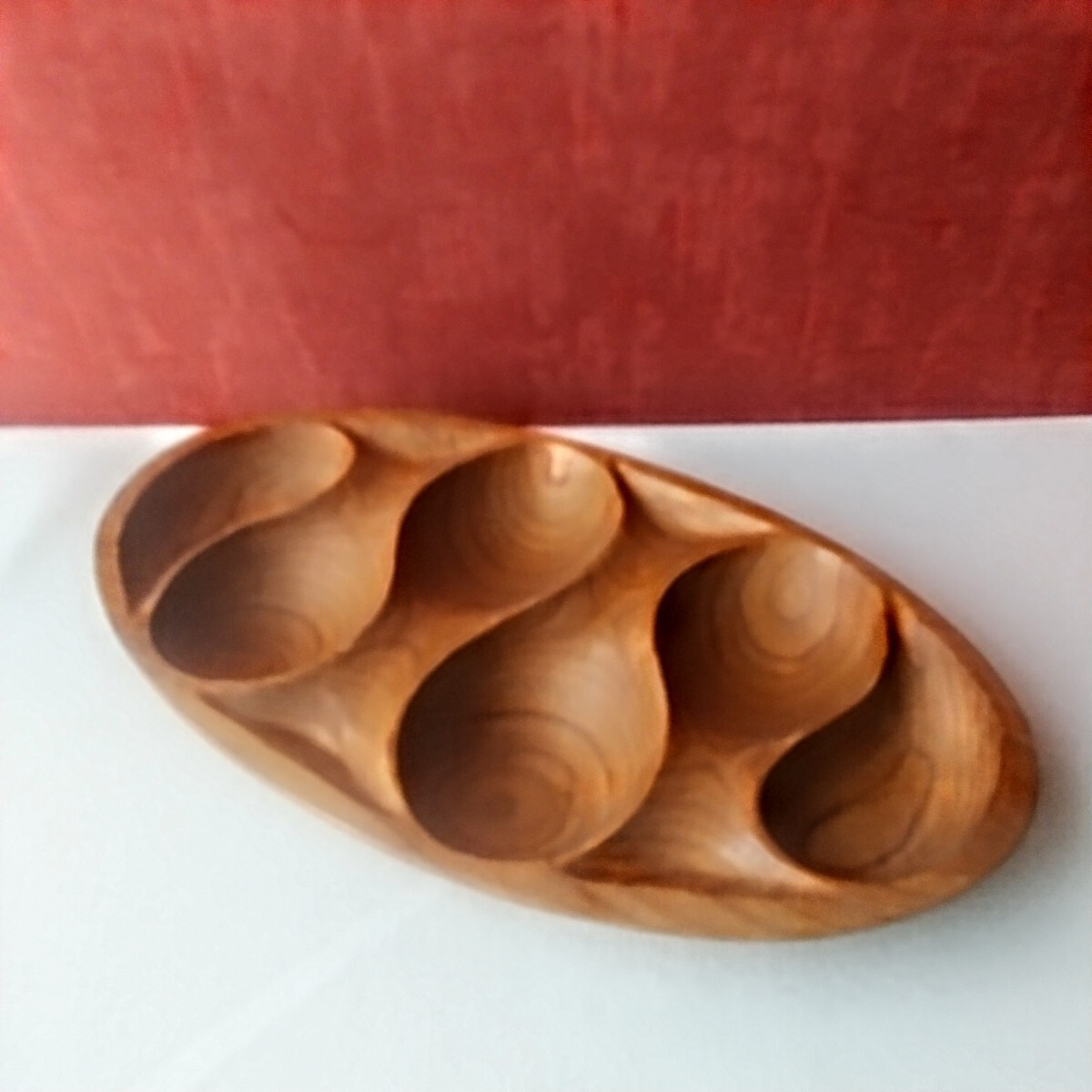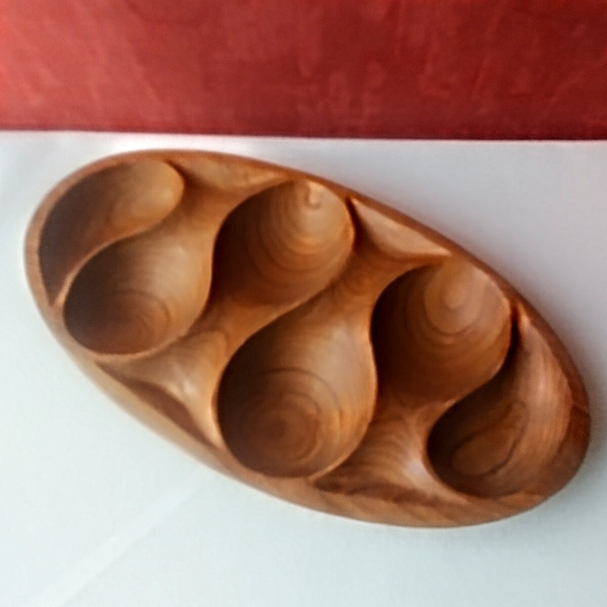 4cmもの厚みのあるチーク材を深くえぐるようにして形作られたフォルムは、トレイというよりオブジェと呼ぶのがふさわしい造形美を湛えています。