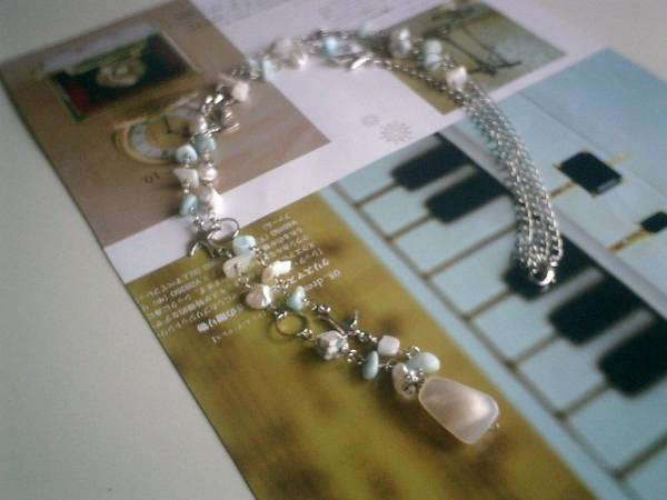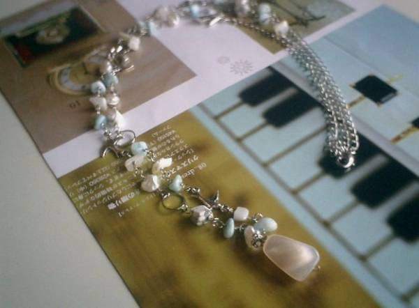 シモーヌの宝石箱・・シリーズです♪春色を集めて・・シックな水色のラリマー、オフホワイトのマザーオブパール、芥子パールやハウライトなど春色を集めたネックレスです♪大きさは6ミリから9ミリ位までのさざれやラフカットです♪小さな小鳥さんのチャームを合わせて可憐な表情です♪長さは全長99センチ位で調節自由です♪トップのマザーオブパールは18×14ミリ位です♪同じデザインの長さ違いのネックレスやブレスレットも出品しています♪シンプルで飽きのこないいつまでも着けられるデザインを考えて作りました!ハンドメイドをご理解頂いてノークレーム、ノーリターンでお願いします