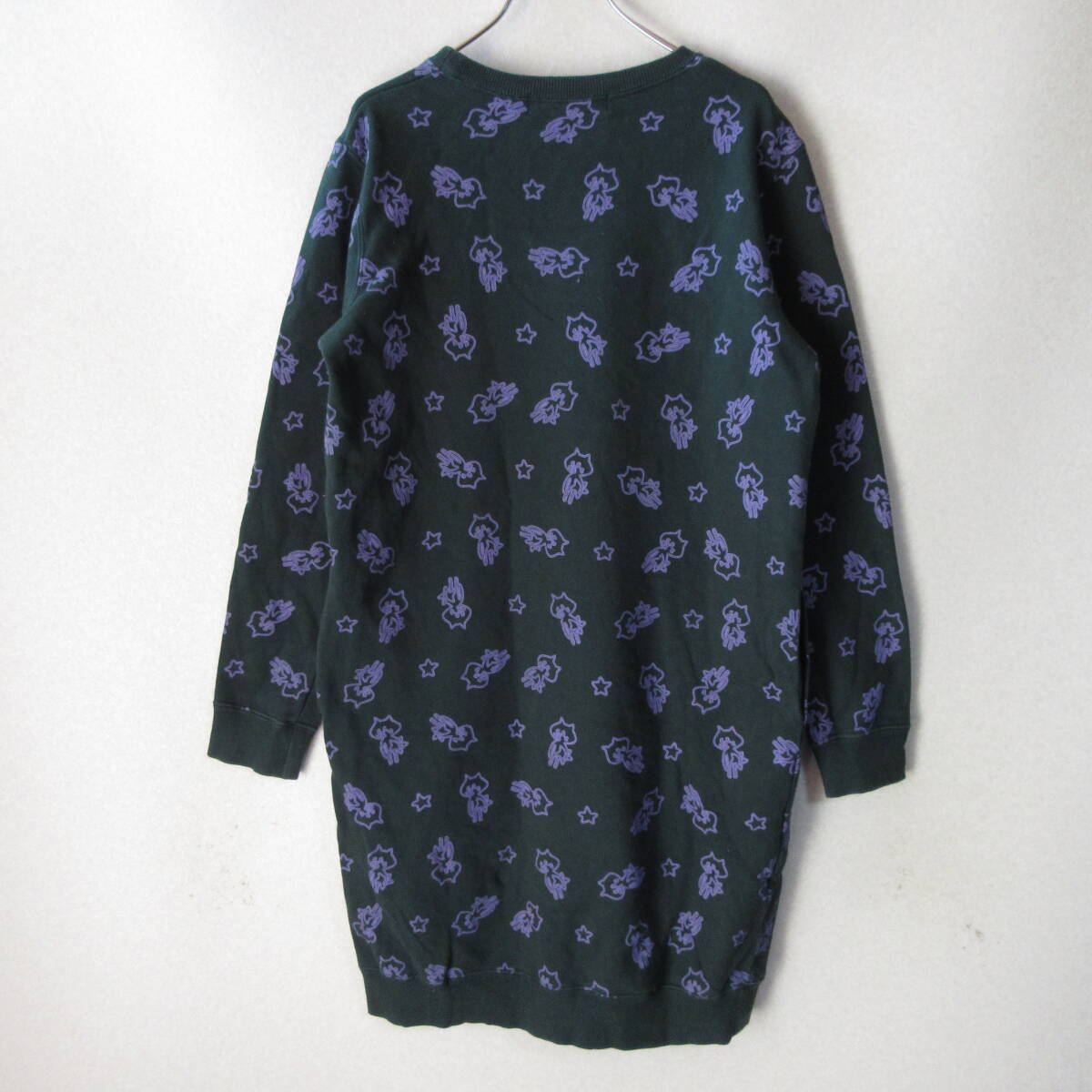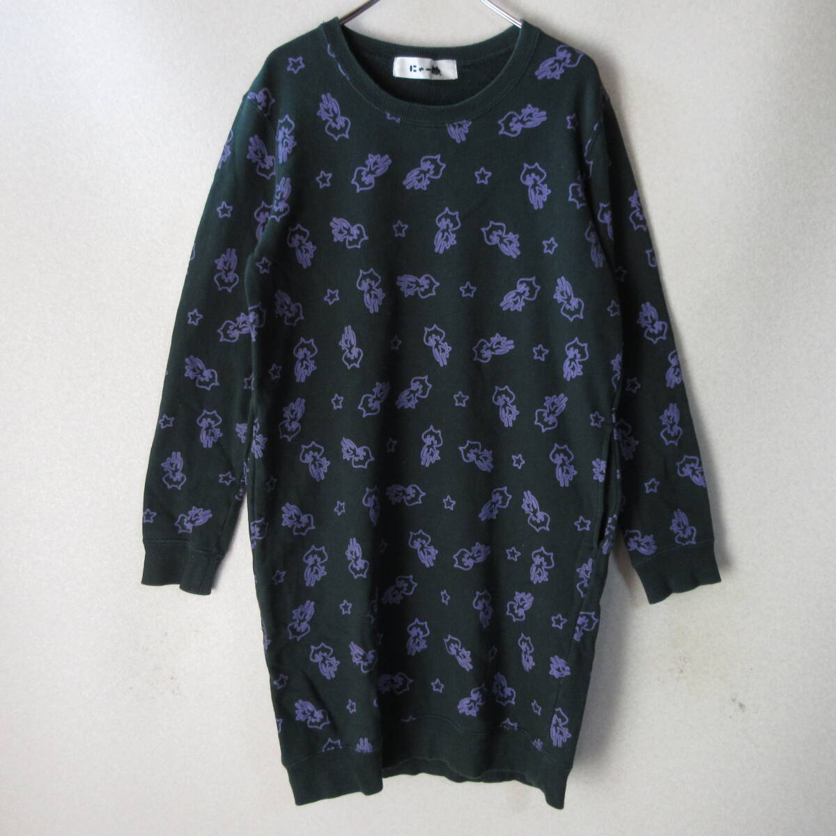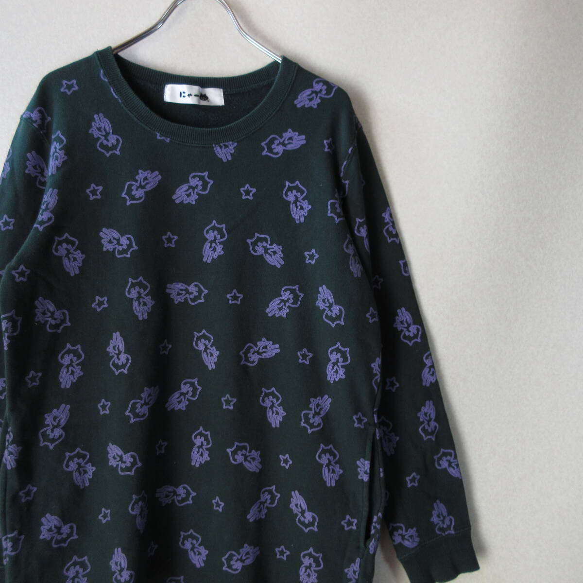 ○良品 にゃー エイネット◆スウェット トレーナー チュニック丈 総柄 プリント◆レディース グリーン サイズ2