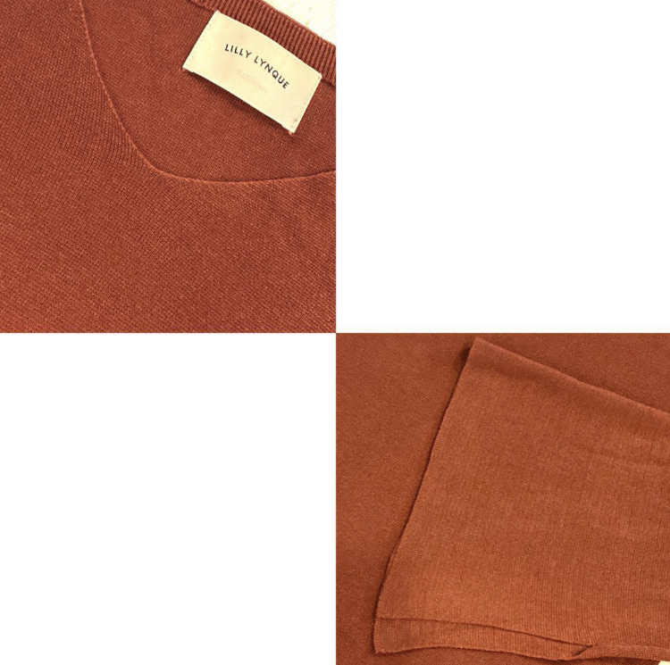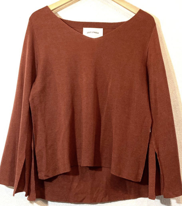 赤みがかったブラウンカラーのニットで、裁断の入ったスタイリッシュなデザインになっています。