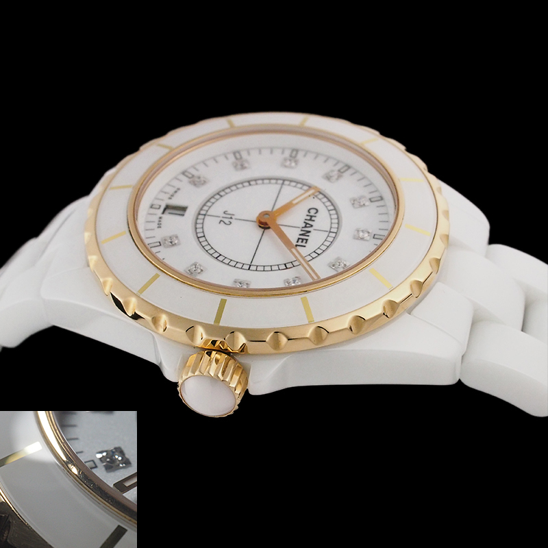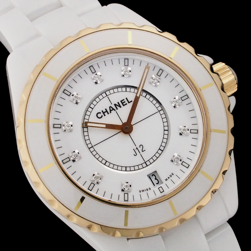備考:爽やかなホワイトセラミックボディと文字盤にピンクゴールドのベゼルとリューズを配した、シャネルを代表する人気モデル「J12」。仕上済で11石の純正ダイヤモンドがインデックスにあしらわれ、新型バックルが備わった、とてもゴージャスなクオーツモデルです。