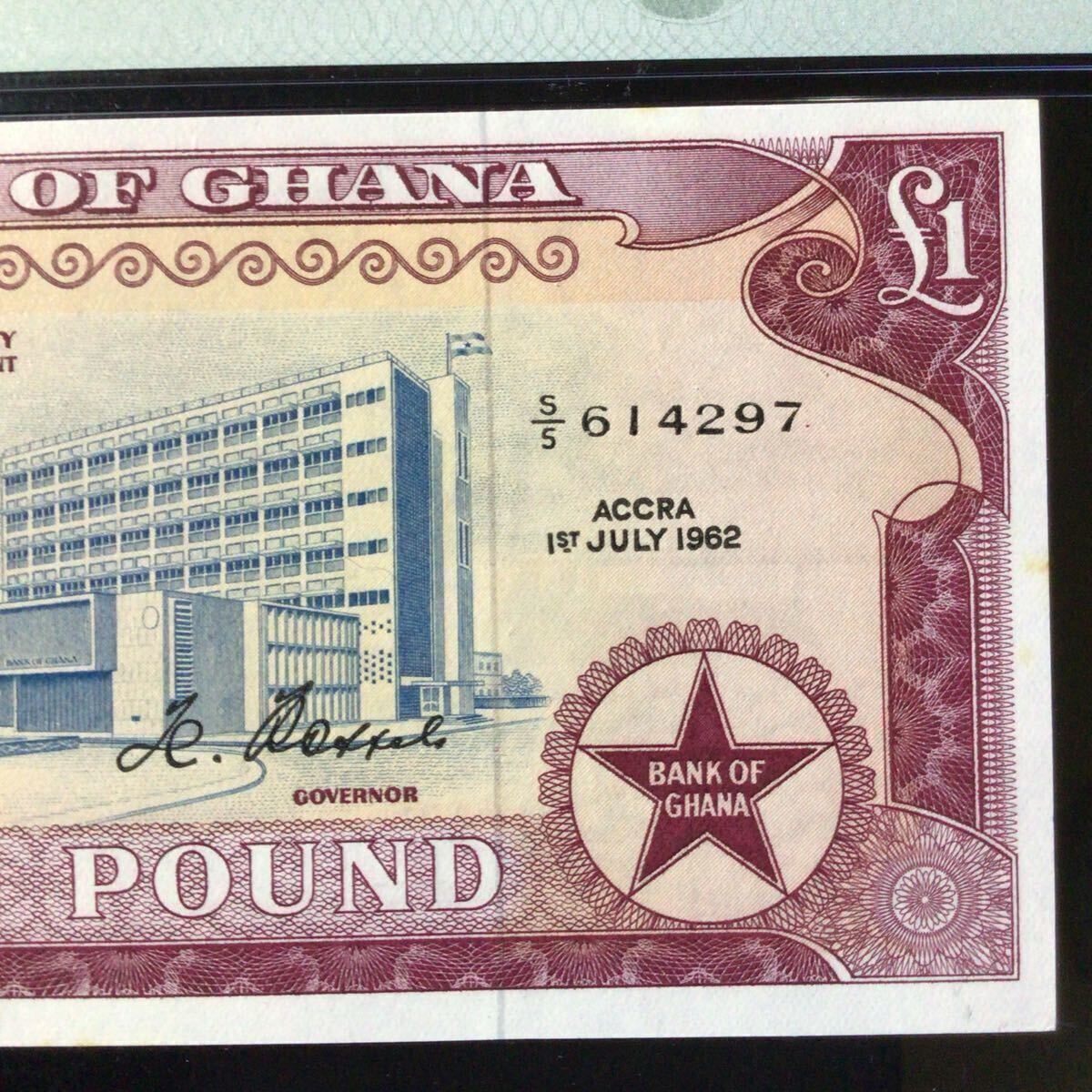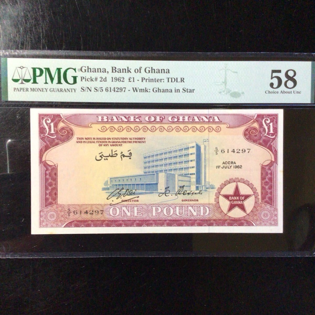 ガーナ《ガーナ銀行》1ポンド【1962】『PMGグレーディング鑑定 未使用 58』*状態表示については、個人によって多少の違いがありますが画像にて判断し納得して頂ける方のみ入札して下さい。