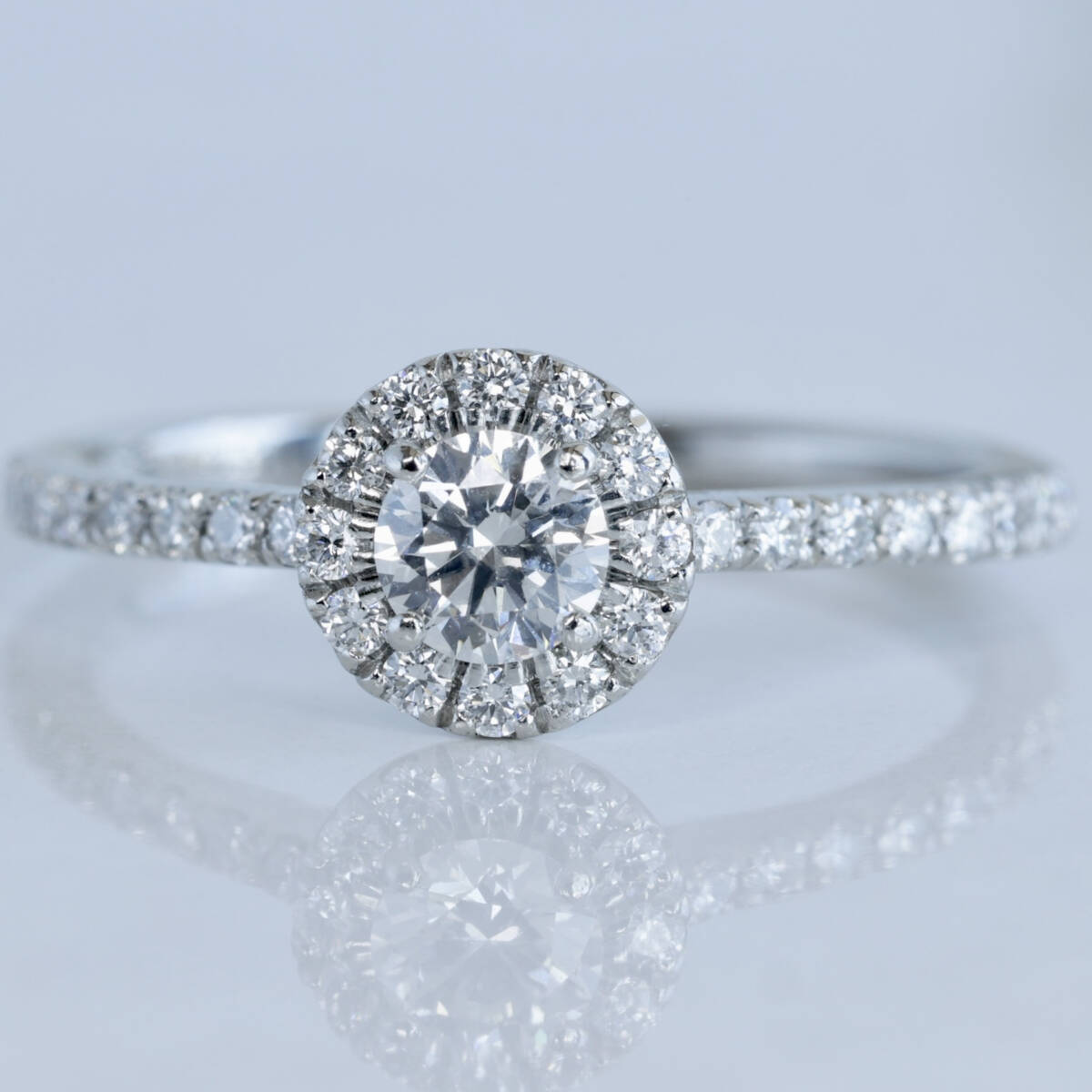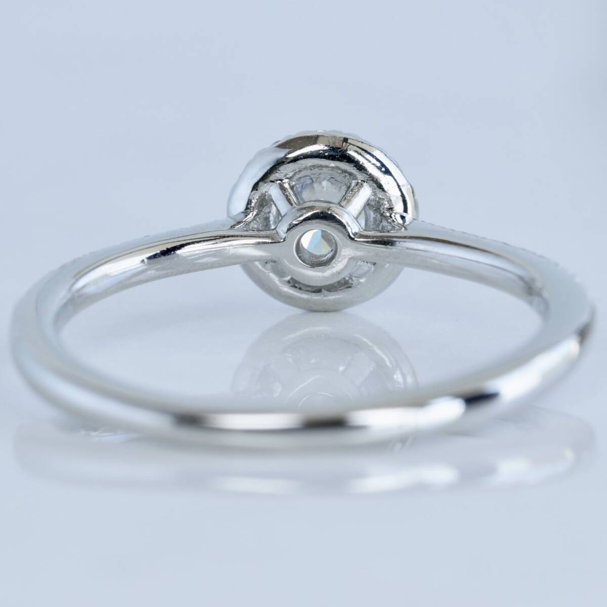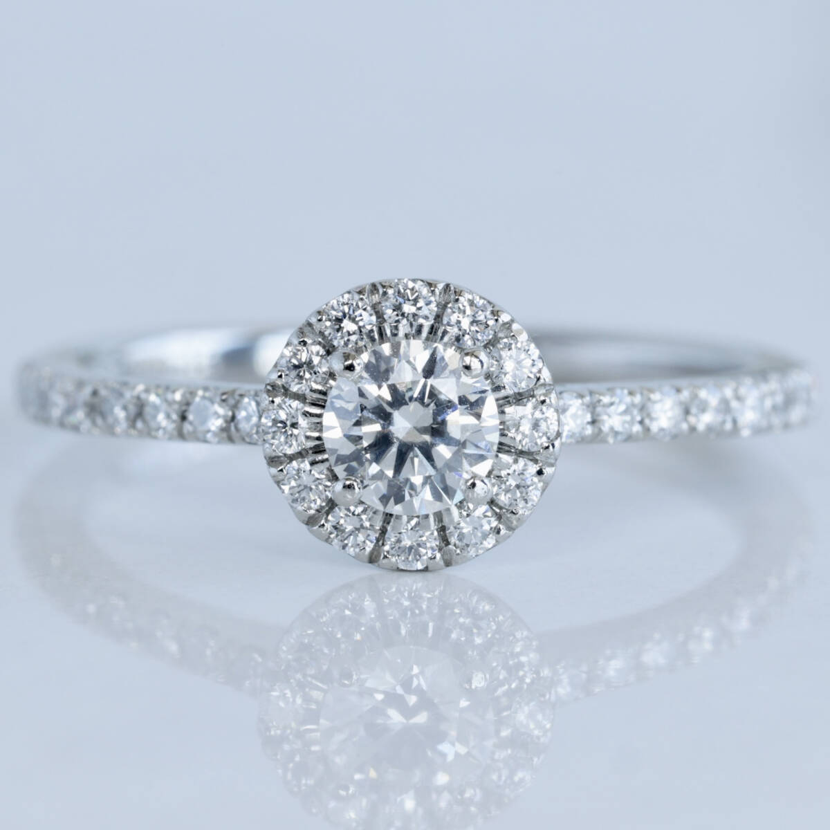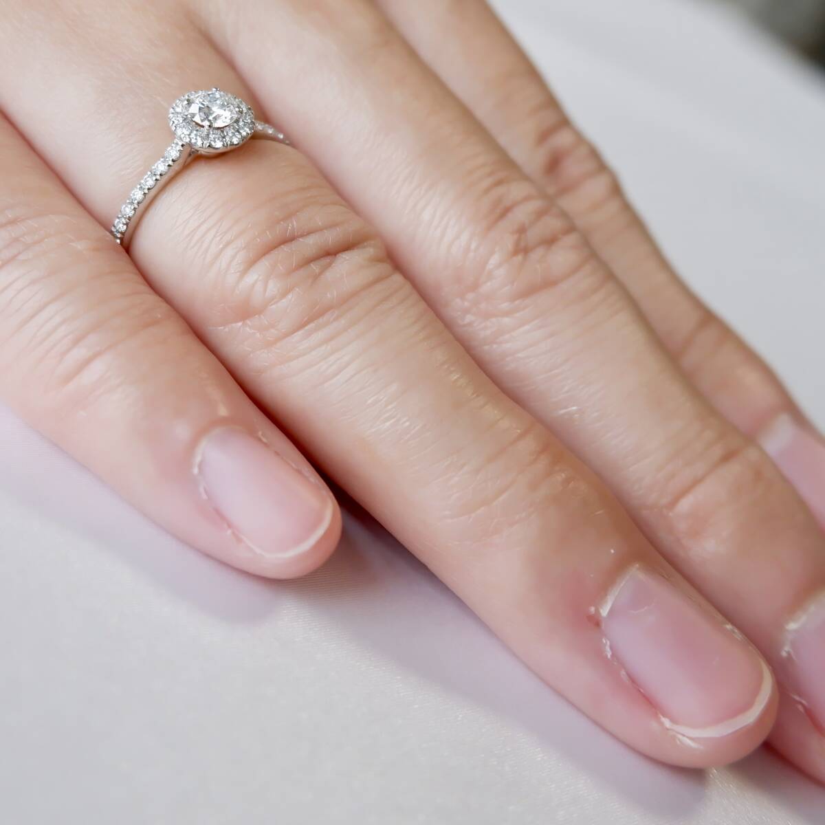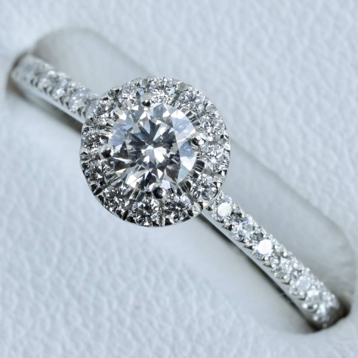 フォーエバーマークダイヤモンドを中心に、周りにも質の高いダイヤモンドが丁寧に配され、綺麗な輝きを放ちます。