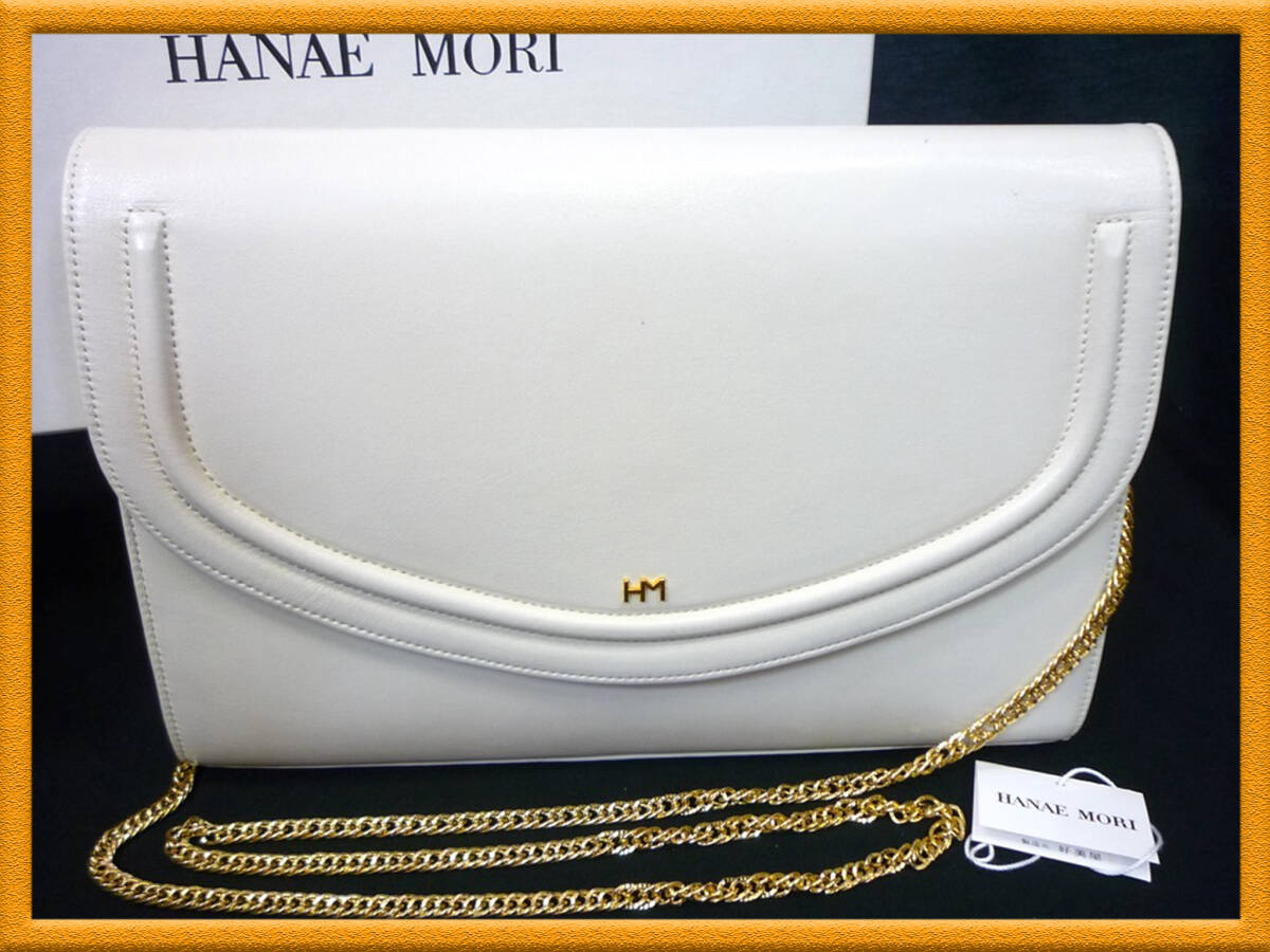 HANAE MORI 森英恵 ハナエモリ チェーン ショルダーバッグ レザー 白 レディース お買得 美品 箱入 高級 エレガント パーティー 結婚式 フォーマル 必見
