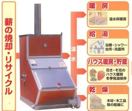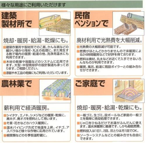 丸太廃材・間伐材・一般ゴミの再利用により焼却・暖房・給湯・乾燥にも使えます。