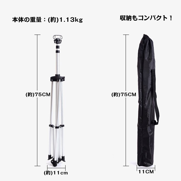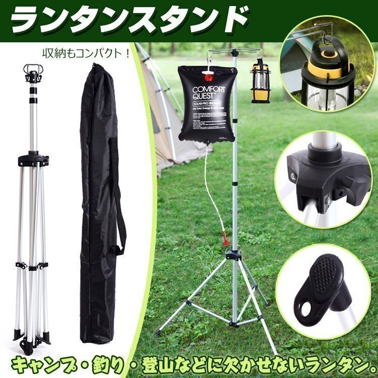 【商品内容】:ランタンスタンド 【サイズ】:(約)幅55cm×奥行47cm 【高さ調整】:(約)87.5cm?195cm 【収納サイズ】:(約)75cm×11cm 【重量】:(約)1.13kg 【素材】:アルミ 【耐荷重】:(約)20kg