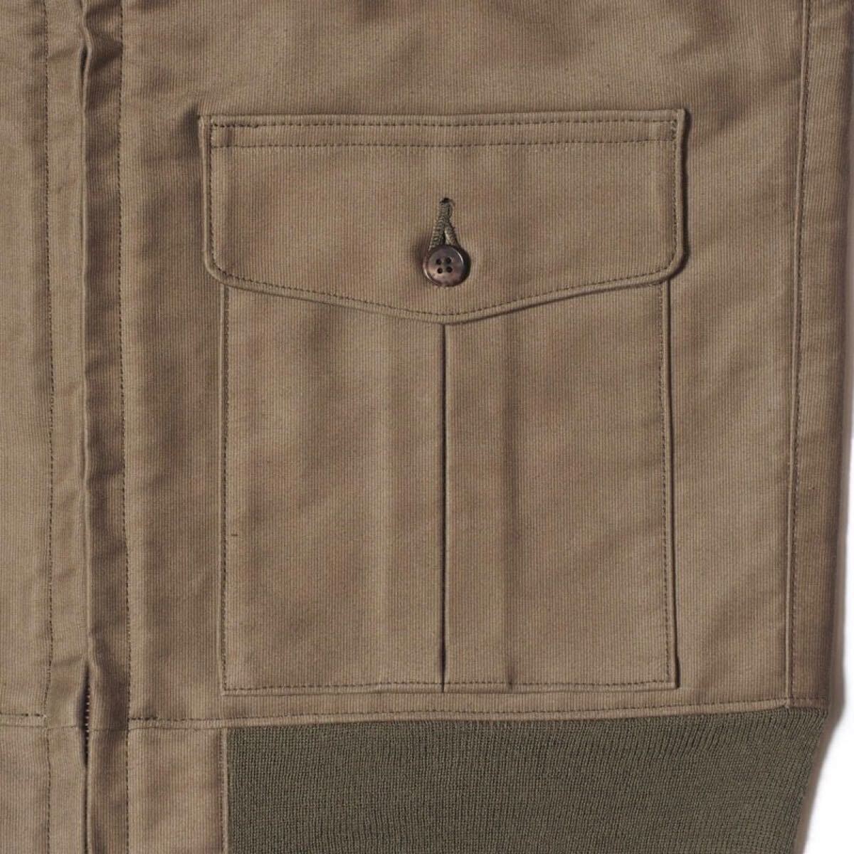 ネックリブにループ状に付けられたボタンホール,シンプルな形状のパッチポケットは、名作であるボタン掛けの「A-1」を彷彿します。