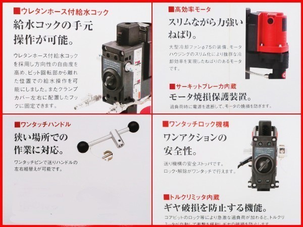 ウレタンホース付給水コックを採用し、方向性の自由度を高め、ビット回転部から離れた位置での給水操作が可能です。また、クランプカバー左右に配置したフックに固定もできます。 | ||