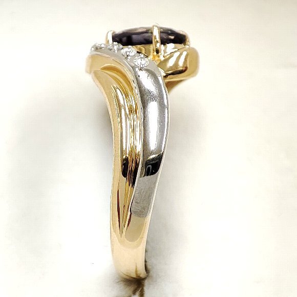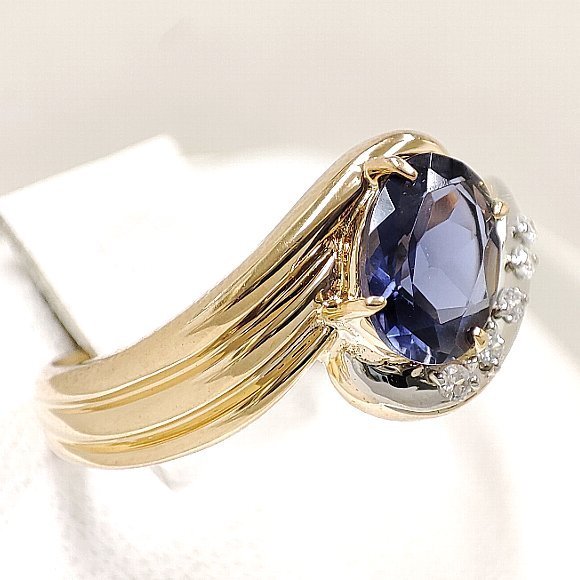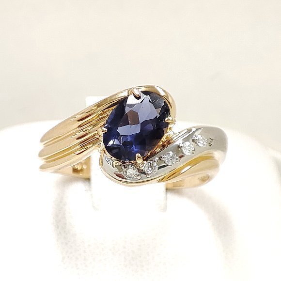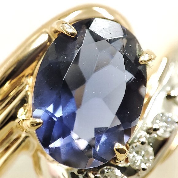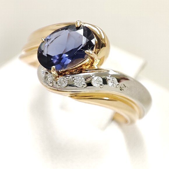 オーバルミックスカットの天然アイオライトをセンターにセットし脇には 合計 0.05カラットのメレダイヤモンドを散りばめ石留めデザインされたリングです。アイオライトは目立った擦れキズやカケも無く紺色は深く透明感も有る綺麗なお石かと思います。素材は 18金イエローゴールドとプラチナ900でリングサイズは 11.5号です。アイオライトの石目は刻印されておりません。 ※こちらの商品は素材の性質上、サイズ直しが出来ませんのでご注意くださいませ。 |