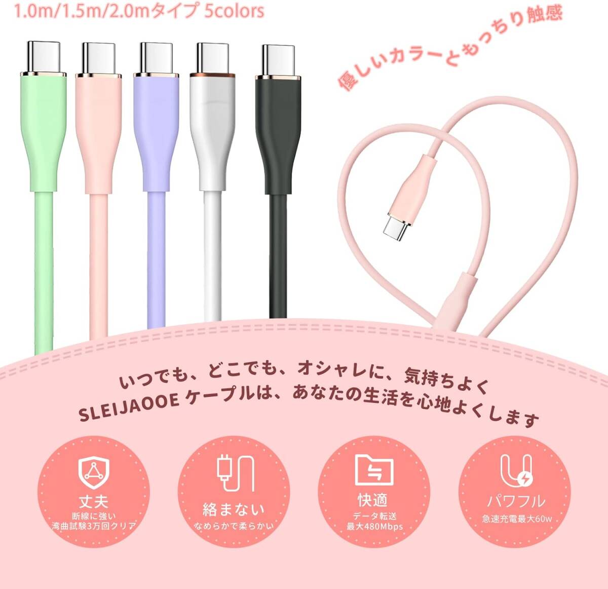 USB Type C ケーブル (1m, ホワイト) 柔らかいシリコン制 SLEIJAOOE【60W PD急速充電】 絡まない 断線防止 タイプC & タイプC(Type-C)ケーブル スマートフォン・タブレット・ゲーム機等Type-C 機器対応