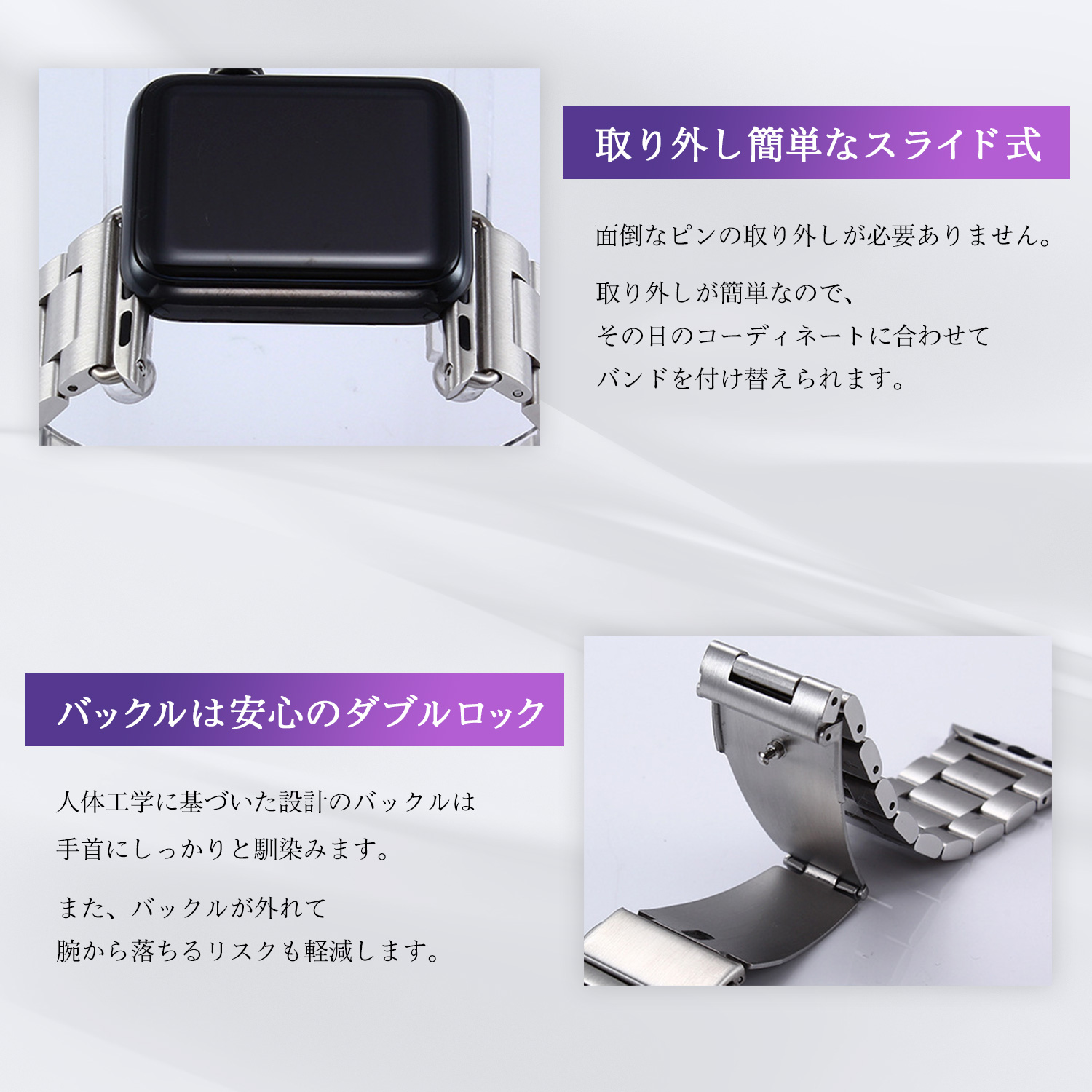 【取り外し簡単】面倒なピン外しは一切不要&スライドさせるだけの簡単取り付け!カラーバリエーションも豊富なので、その日の気分に合わせて気軽に付け替えできます。また、付属のサイズ(コマ)調整工具を使用すれば簡単に長さ調節できます。