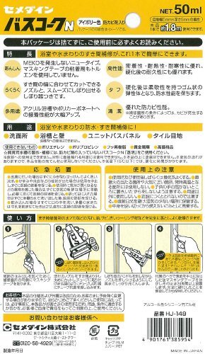 1本・アイボリー 50ml HJ-149・・Color:アイボリーStyle:1本・防水シール・洗面所、浴室・原産国:日本・梱包サイズ:30.0 x 125.0 x 205.0 mm商品紹介 【用途】 ●浴室や水まわりの防水・すき間補修に! ●洗面所・浴槽の外側と壁・ユニットバスパネル・タイル目地 【特長】 ●本品1本で約1.8m使用できます(5mm×5mmの場合) ●MEKOを発生しないニュータイプ。マスキングテープの粘着剤もトルエンを使用していません。 ●密着性・耐熱性・耐寒性にも優れ、硬化後の耐久性にも優れます。 ●すき間の幅に合わせてカットできるノズルと、スムーズにしぼり出せるしぼり器つきです。 ●硬化後は柔軟性を持つゴム状の弾性体となり、防水性能を保ちます。 ●防カビ剤入り、優れた防カビ性能(条件によってはカビが発生することがあります) ●アルコール型シリコーン充てん材 ●アクリル浴槽、ポリカーボネートなど新素材にもよくつくニュータイプ ●耐久性2倍 ●イヤな臭いがしない 【使用できないもの】 ●浴槽の内側 ●ポリエチレン・ポリプロピレン・フッ素樹脂・貴金属類・高価格品 ●飼育用水槽の制作・補修には。防カビの入っていないバスコークN「透明」をご使用下さい。 ●食器への使用はできません。 ●体に直接触れる用途には使用できません。 ●本製品の上に塗装はできません。 ●変色の恐れがあるので他の充てん材を併用しないでください。 【使用上のご注意】ポリエチレン、ポリプロピレン、フッ素樹脂、ポリアセタール等には接着できません。貴金属や高価格品の接着には使用しないで下さい。換気を十分にしてご使用下さい。