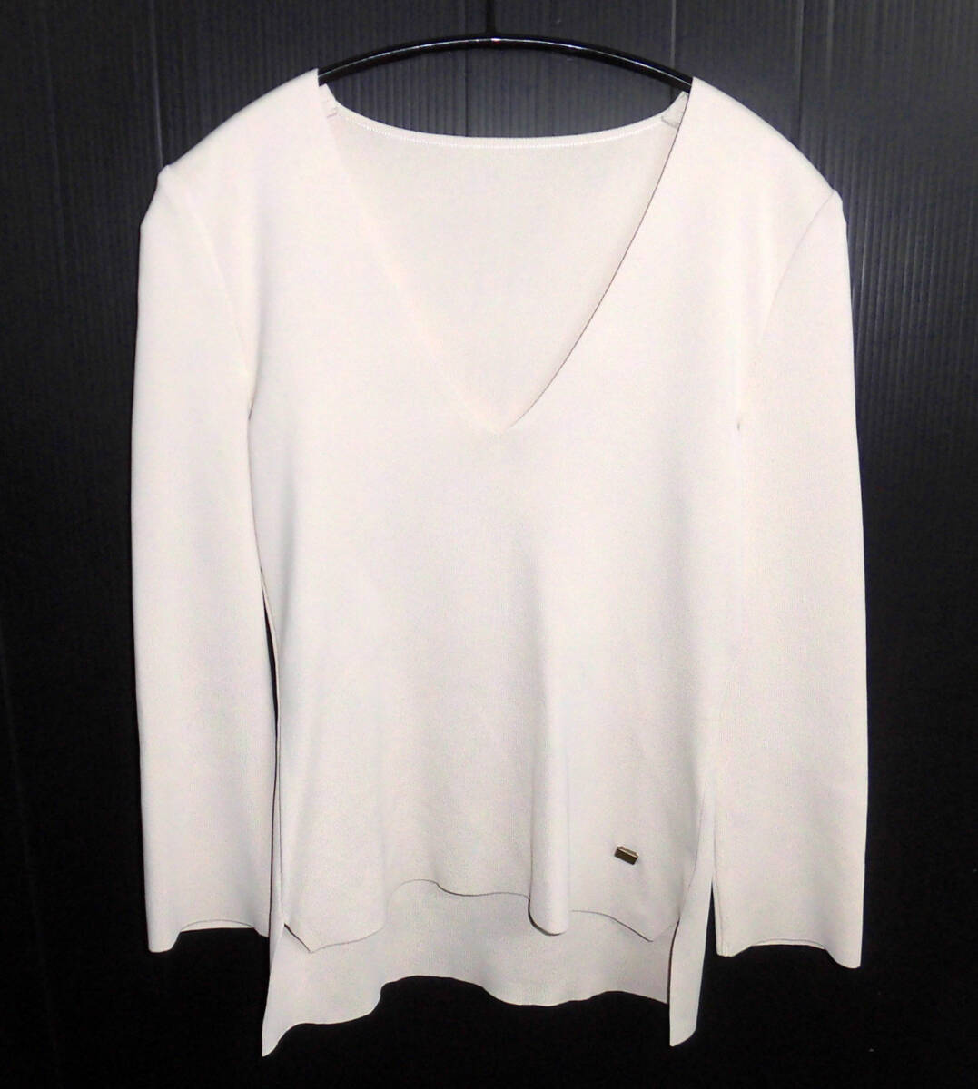 リブ編みの伸縮性を備え、Vネックのデコルテを綺麗に見せてくれる一着です。
