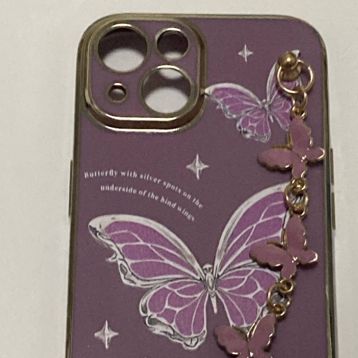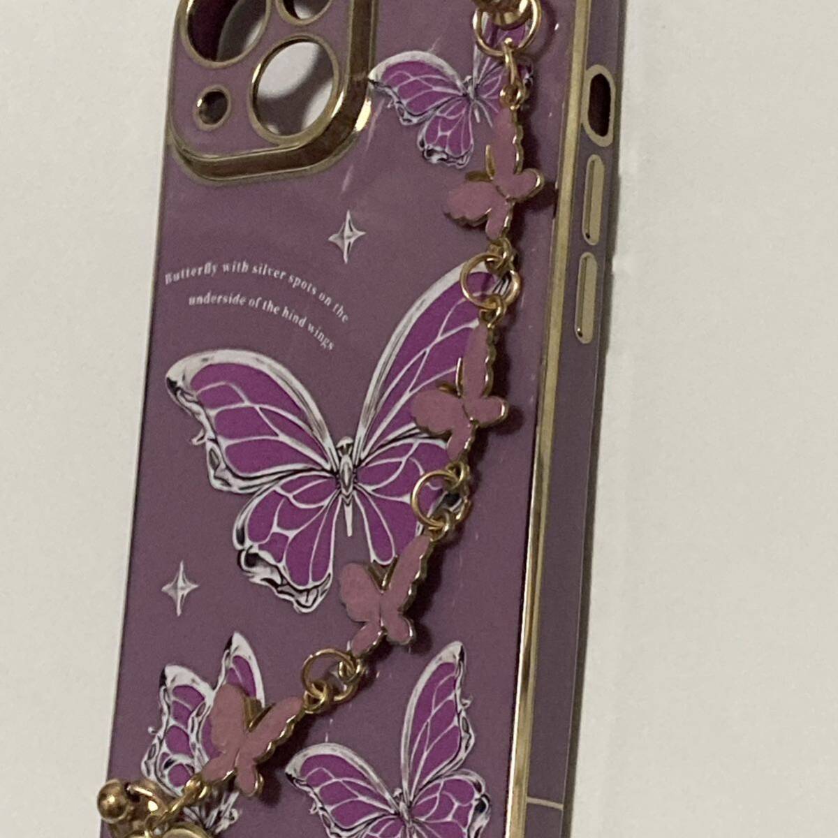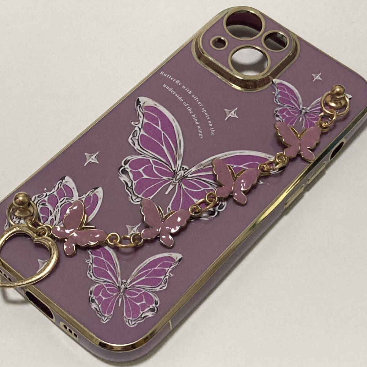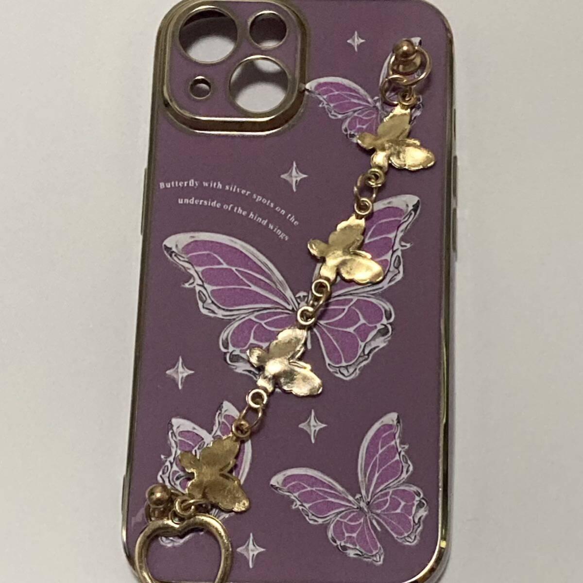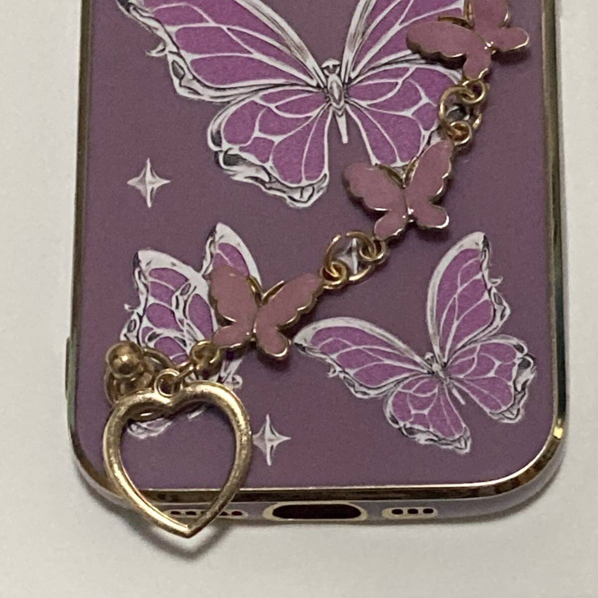 新品送料無料 iphone15ケース きれいな蝶々のアクセサリー風ケース おしゃれ ハートと蝶 取っ手付き ストラップ パープル ゴールド