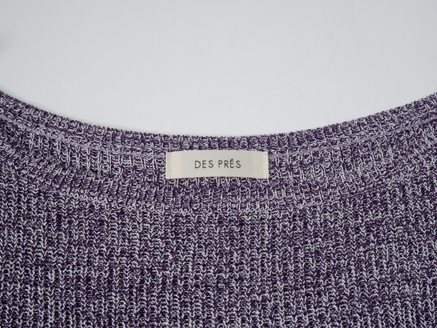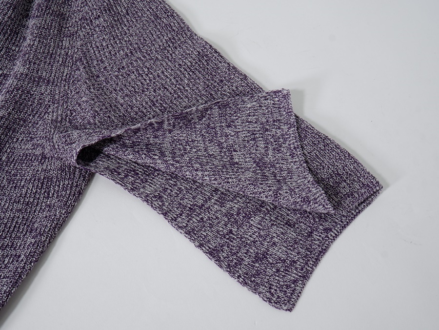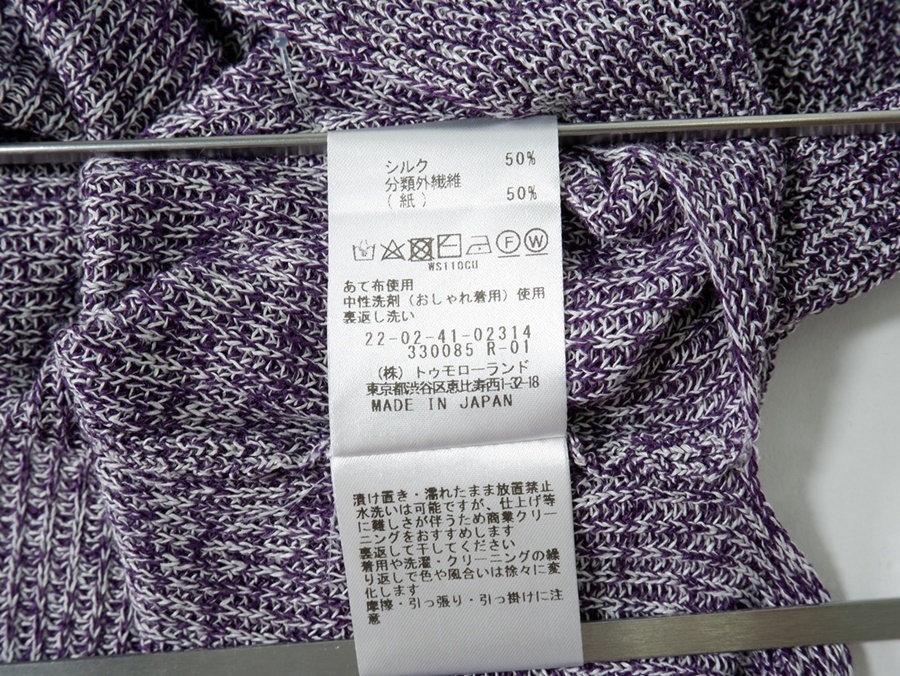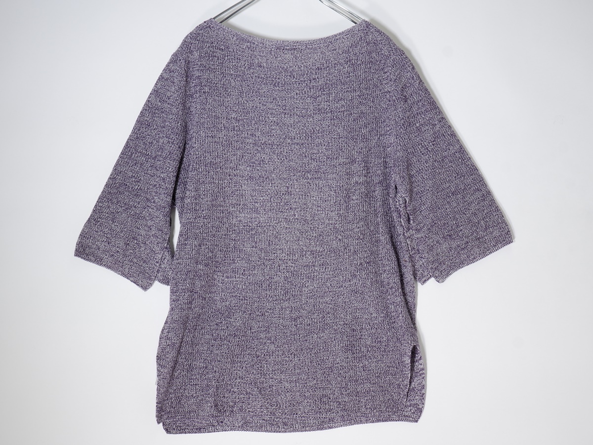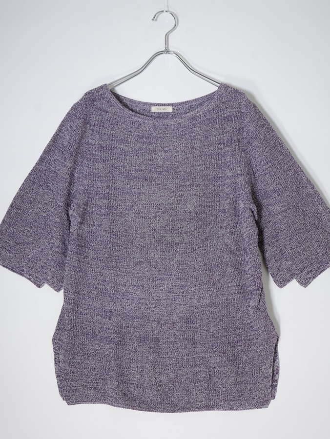 【素材感】やや薄手のニット地 【透け感】なし 【裏地】なし 【ストレッチ】なし 【開閉デザイン】なし 【付属品(取り外し可)】なし 【商品情報】シルクと美濃和紙を撚糸し、片畦組織に織り上げたニット素材のプルオーバー。シルクをパープル、和紙を無染色の片染めにしており、双方に番手差があるため均一ではなくムラのある見え方に仕上がっています。和紙のカリカリとした独特なタッチにシルクのわずかなツヤ感がプラスされた上品な表情が魅力です。ゆったりとしたシルエットにやや横に広いネックラインでリラックスムード漂う一枚。袖下にスリットが入っているので腕を動かすたびに袖口がゆれニュアンスをプラスしてくれます。シンプルながらも一枚でさまになり、幅広いシーンでお召いただけるアイテム。 |