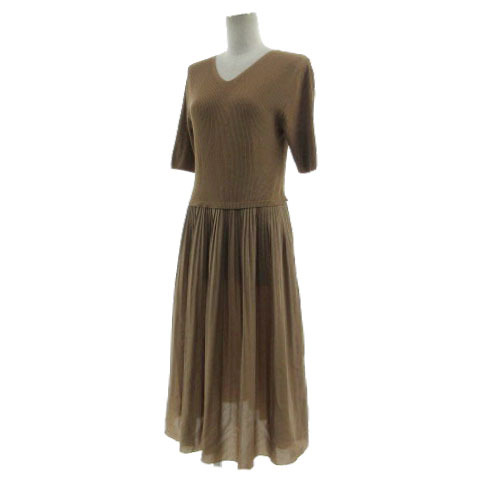 インディヴィ INDIVI 洗える シワになりにくい ドッキングワンピース 127-57420 Vネック ニット切替え 半袖 プリーツ ミディ丈 茶 38