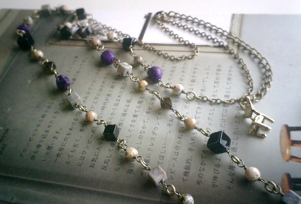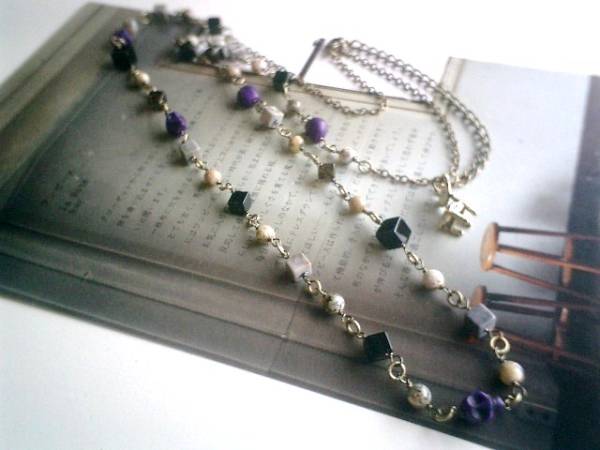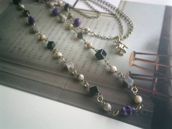 天使の時間・・シリーズです♪都会の髑髏さん・・シックなスモーキークォーツやアフリカンオパールやオニキスやジャスパーにダークパープルの髑髏さんを合わせてスタイリッシュなネックレスです♪6ミリから9ミリ位の丸玉やキューブのスモーキークォーツやアフリカンオパールやオニキスやジャスパーに9ミリ位のボーンの髑髏さんを合わせました♪長さは全長112センチ位で調節自由です♪2連にされても素敵です♪お揃いのブレスレットやピアスも出品しています♪シンプルで飽きのこないいつまでも着けられるデザインを考えて作りました!ハンドメイドをご理解頂いてノークレーム、ノーリターンでお願いします