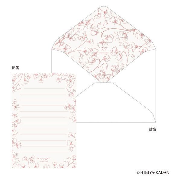 ○手軽でかわいいミニサイズの便箋と、内面に花柄が印刷された封筒のセット。