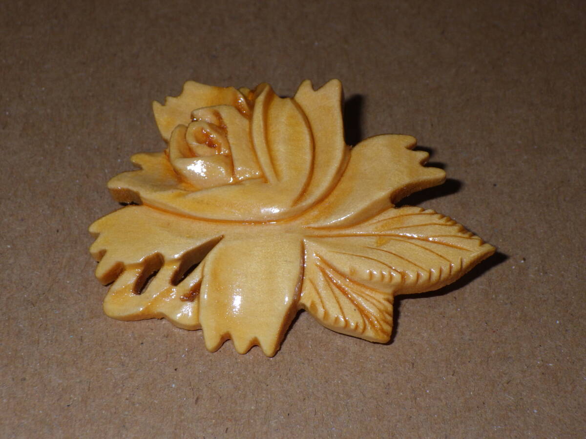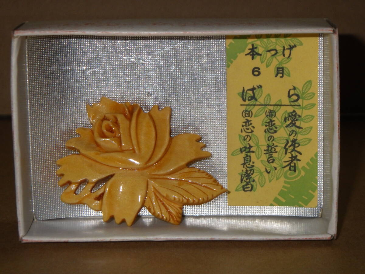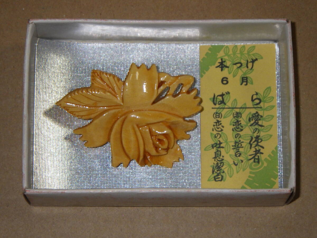 未使用 木彫り 木つげ ばら バラ 薔薇 ブローチ バッチ 愛の使者