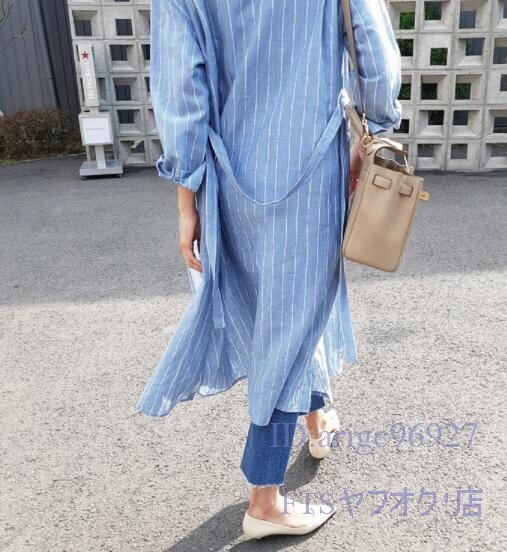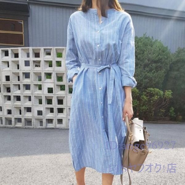 T121☆新品春秋 レディースファッション 丸ネック ボーダー フォーマル膝丈 ロング丈シャツ シャツワンピース コート アウト ブルー M-XL
