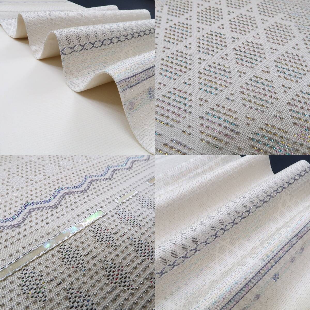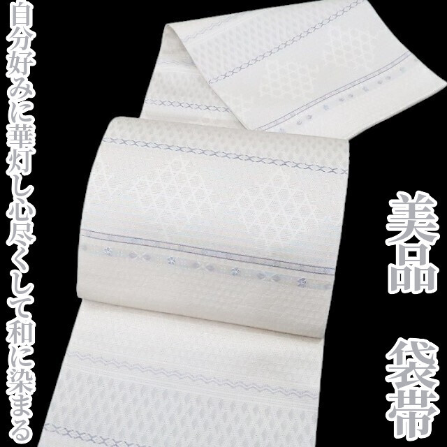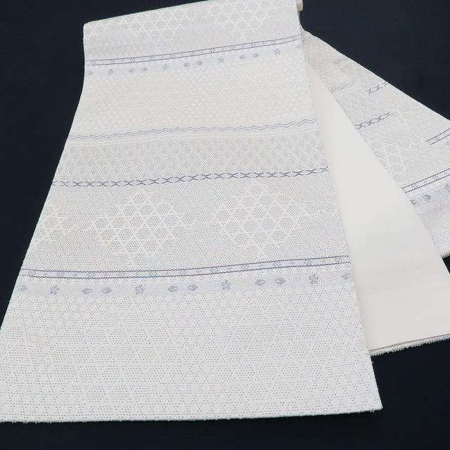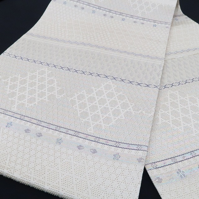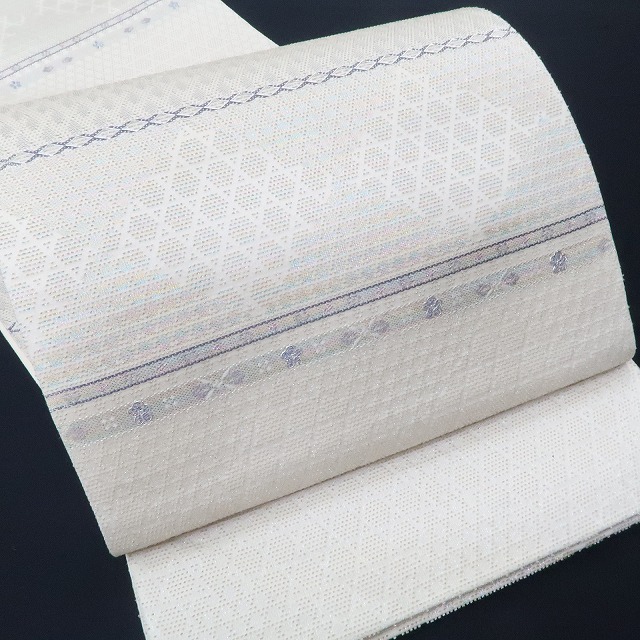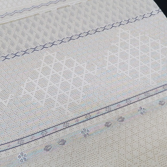 正絹素材のしなやかな質感に生成り色とシルバーの色糸が放つ滑らかな光沢、現代的な感性で横段状に織り出された花や和柄の組み模様、籠目や花菱のデザイン柄が醸し出す和を心得たモダンな色艶…醸し出される趣に誰をも惹きつけるこの帯の魅力が潜んでいます。