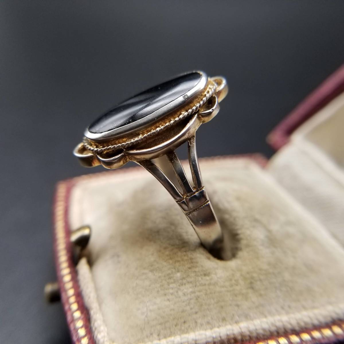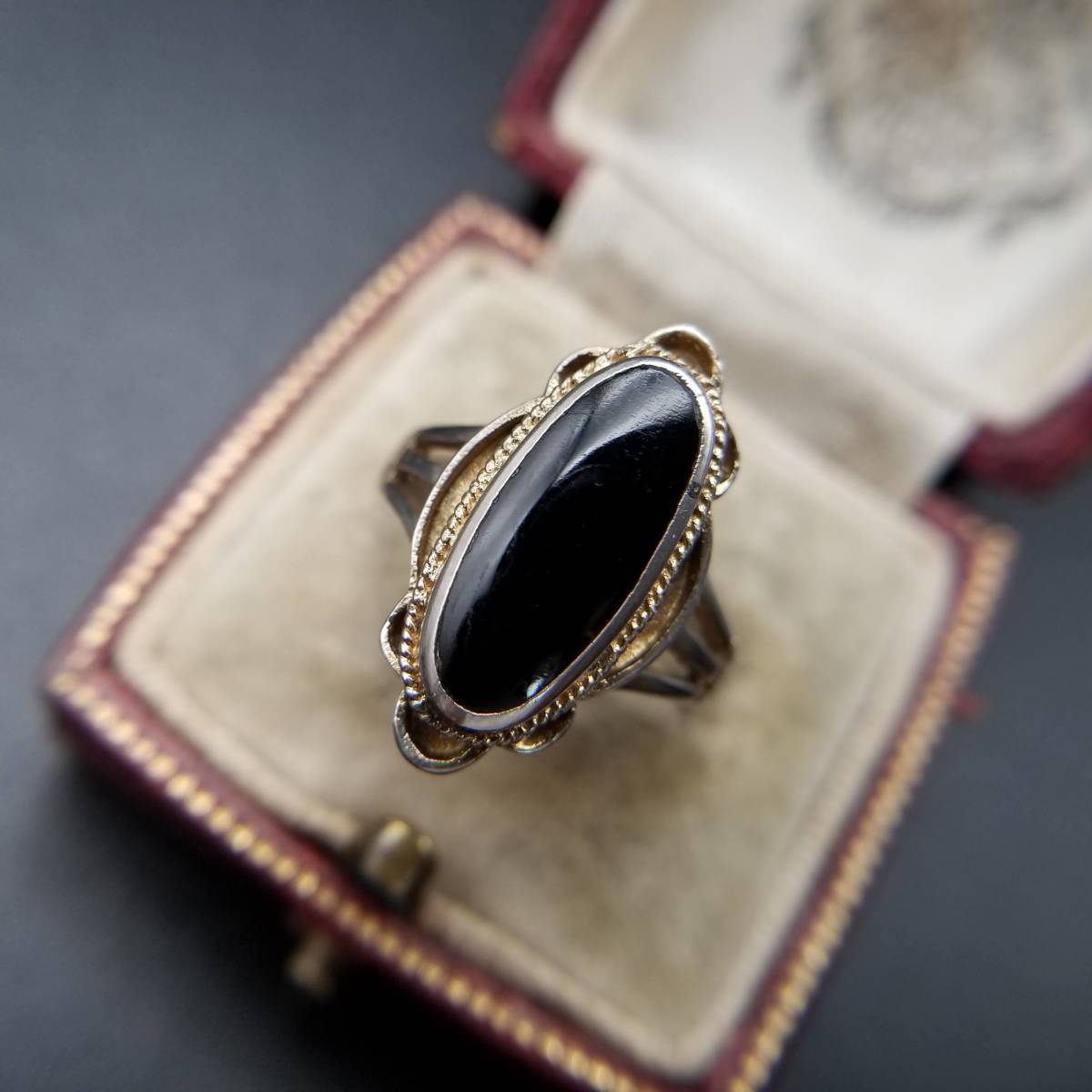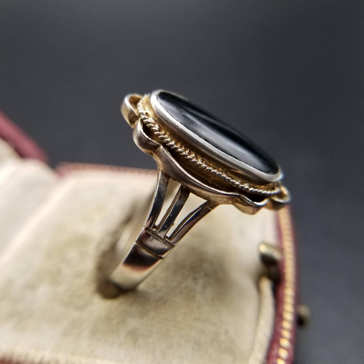 オニキス ロングオーバル ケーブルリム ヴィンテージ フラワー リング シルバープレート 指輪 サウスウェスタンスタイル 大きめサイズ