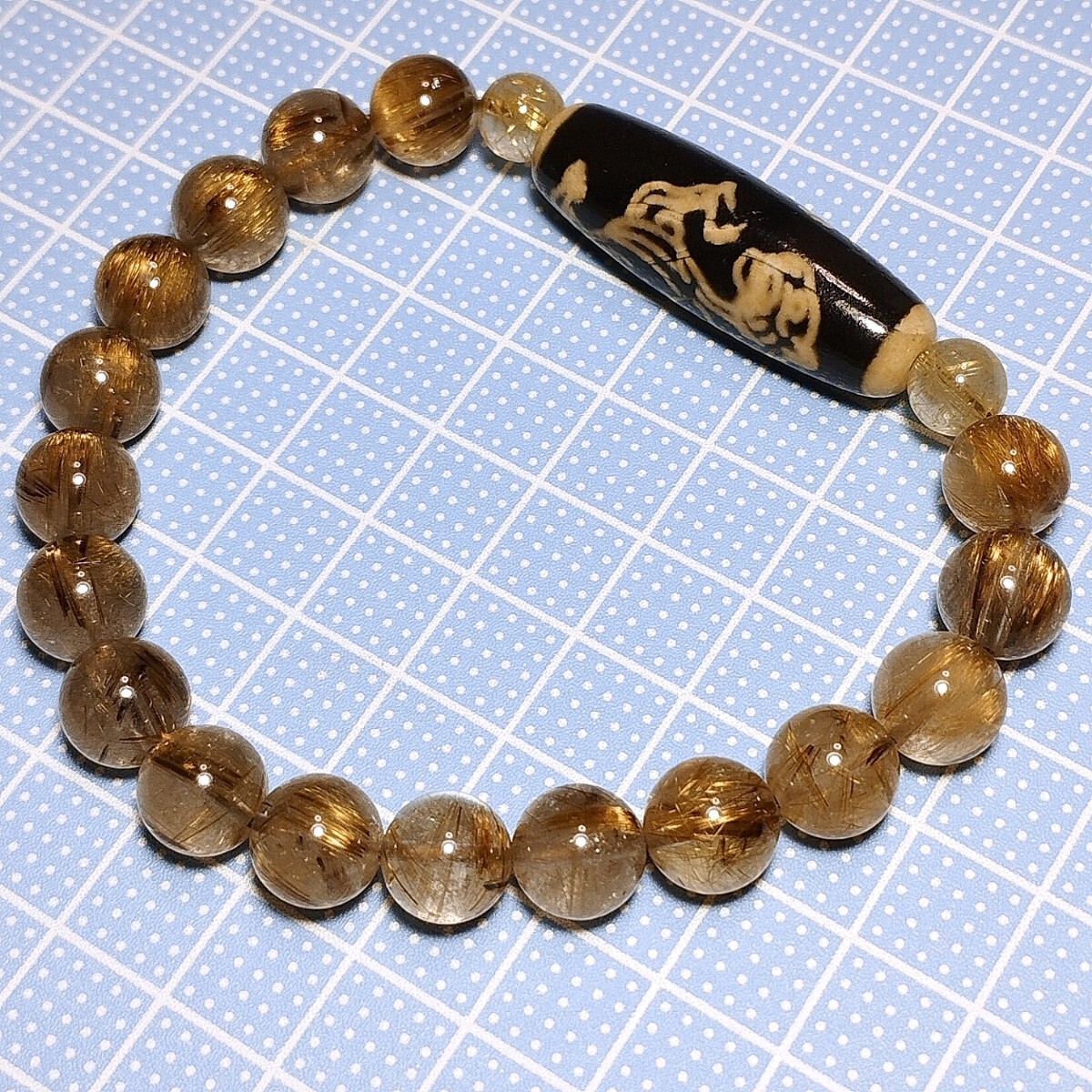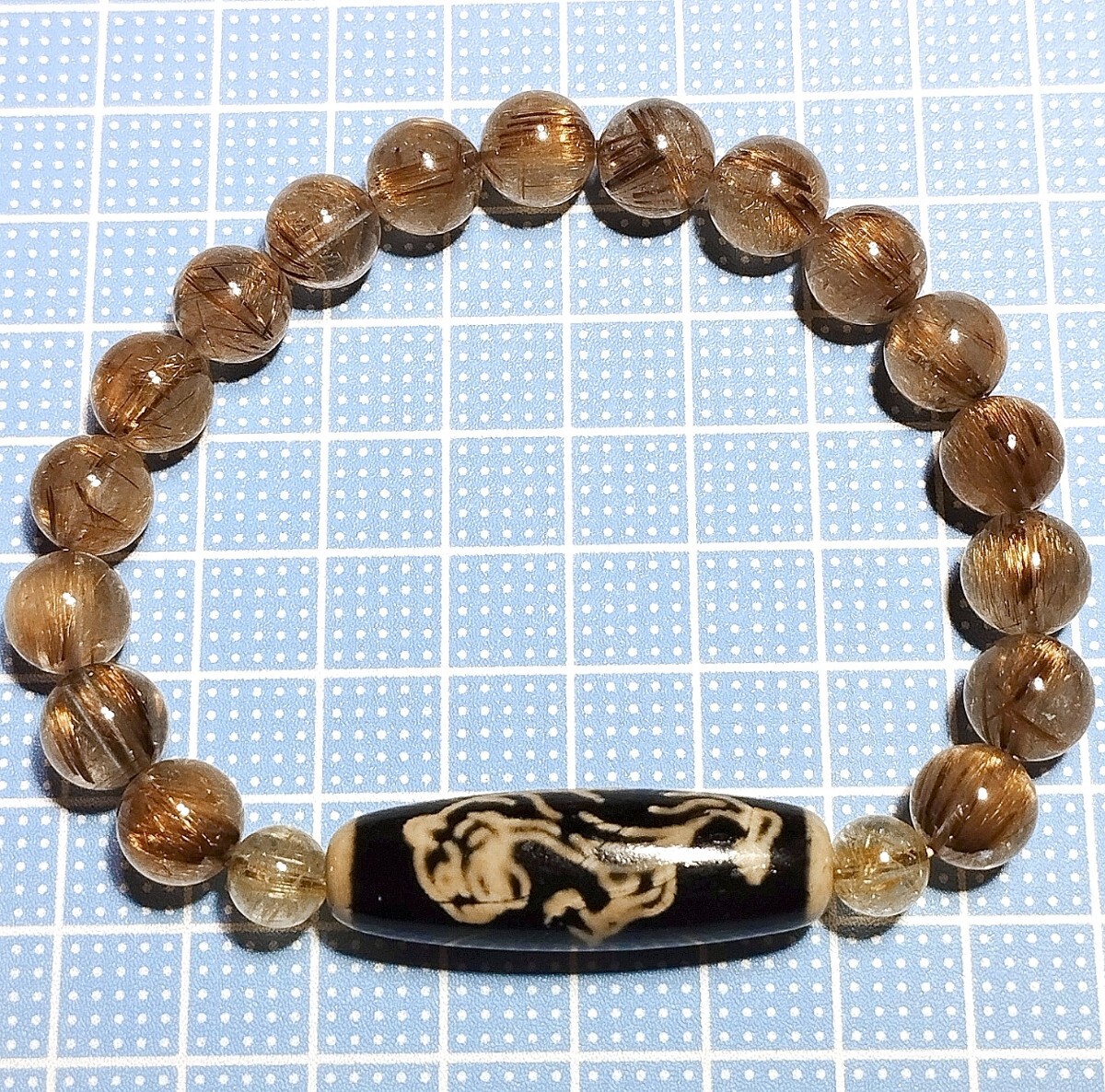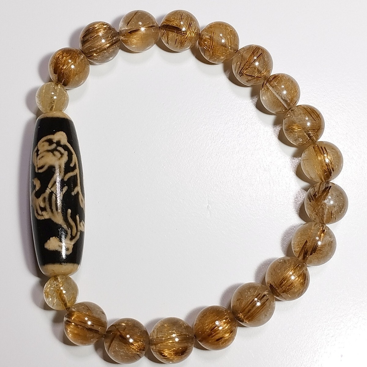 白虎天珠(虎天珠)にタイガータイチンルチルクォーツ・ゴールドルチルクォーツを合わせたデザインブレスレットです。