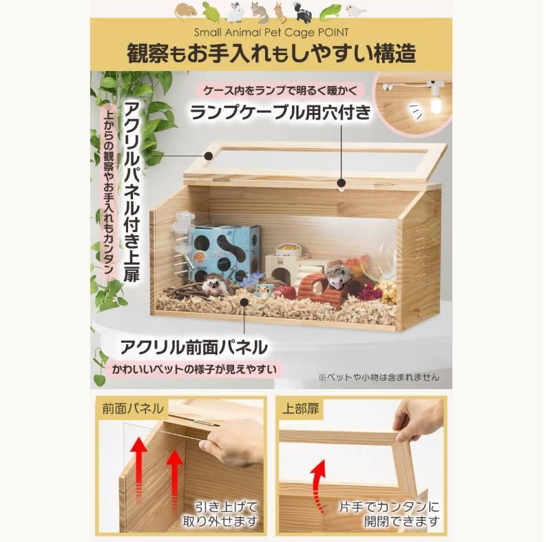 【POINT4:手入れのしやすさ】前面パネルは取外し可能で上扉も折り返し付きなので、糞尿の処理や模様替え等もカンタンに行う事が可能です。