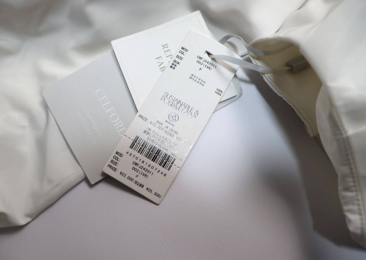 CELFORD (セルフォード) ペプラムバルーンブルゾン 裾のペプラムバルーンシルエットがとてもかわいいお品です。 商品詳細… リサイクルポリエステルを使用した、撥水機能付きのぺプラムブルゾン。 軽くて皺になりにくく、しなやかでほんのりハリのあるタフタ素材。 撥水加工を施しているため、汚れがつきにくく急な雨にも対応できる優れものです。 ペプラム部分はバルーン仕様で丸みを出し、袖も構築的な曲線のフォルムで優しく柔らかな印象に。 ファスナーの引手はCELFORDオリジナル資材を使用し、グログランで片結び風のリボンを作りワンポイントにしています。 ポケットは手を入れやすいよう前側に切替を作り配置しました。 裏地付きなので、まだまだ肌寒い季節から活躍するアイテムです。 新品・未使用、紙タグ付きです。 ご質問はお気軽にお問い合わせくださいませ。 ◆カラー: アイボリー ◆サイズ フリーサイズ (ブランドによりサイズ感が異なります。実寸を参考になさってください。) ◆平置き実寸(約): F:総丈:71cm 肩幅:46.5cm 袖丈:47.5cm 袖ぐり:42cm バスト:98cm ◆素材:表地:ポリエステル100%/裏地:ポリエステル100% ◆新品・未使用 ◆定価25,300円(本体23,000円+消費税) |